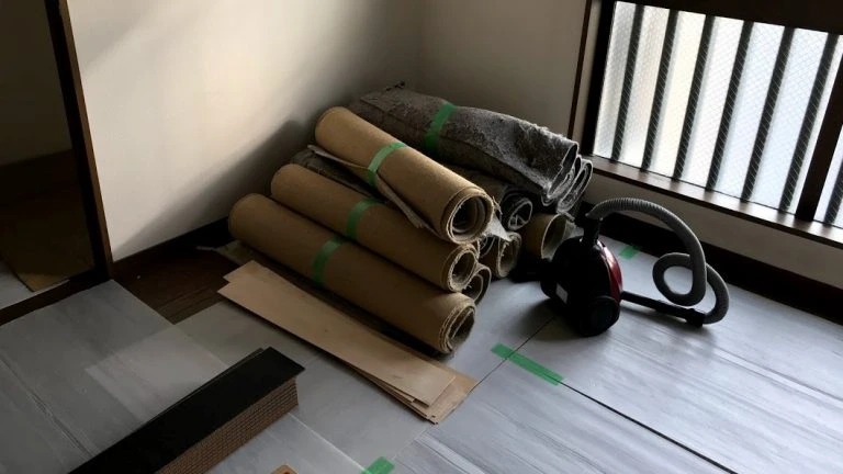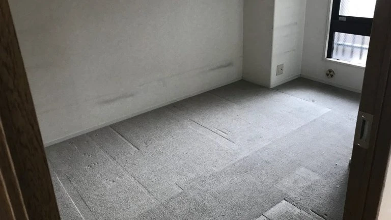 古いカーペットを捲(めく)っていきます。ボンドの付き方によっては、カーペットを捲るのも容易ではありません。また、撤去すると、ゴミもかさばるため、処分費もそこそこかかります。
