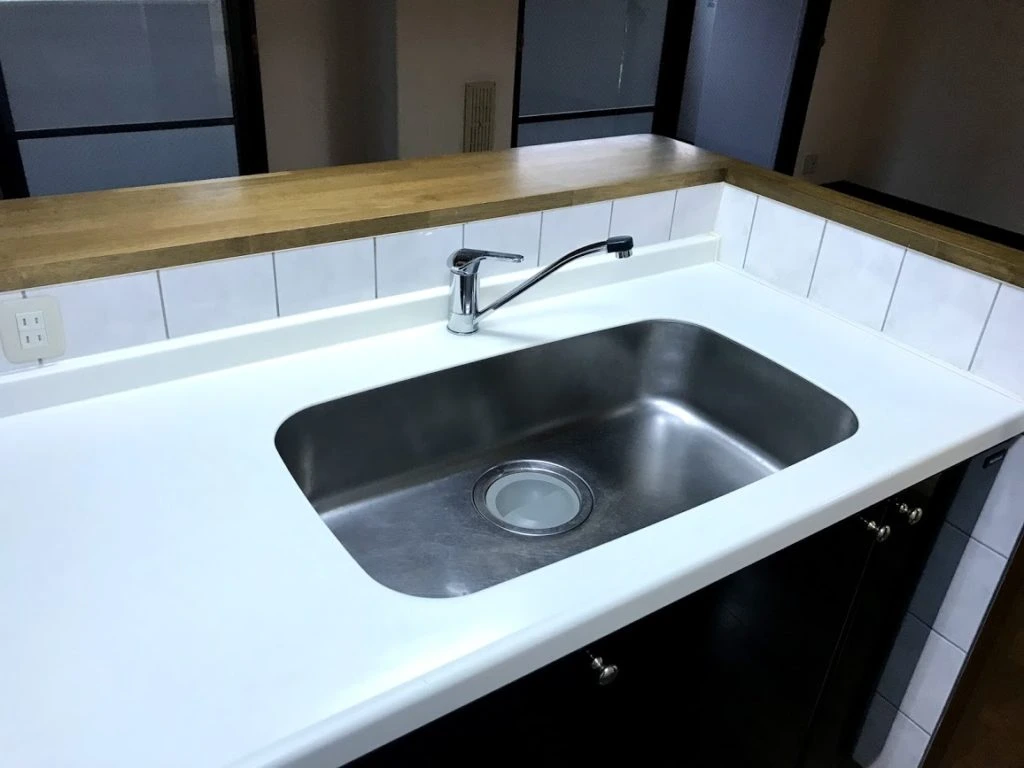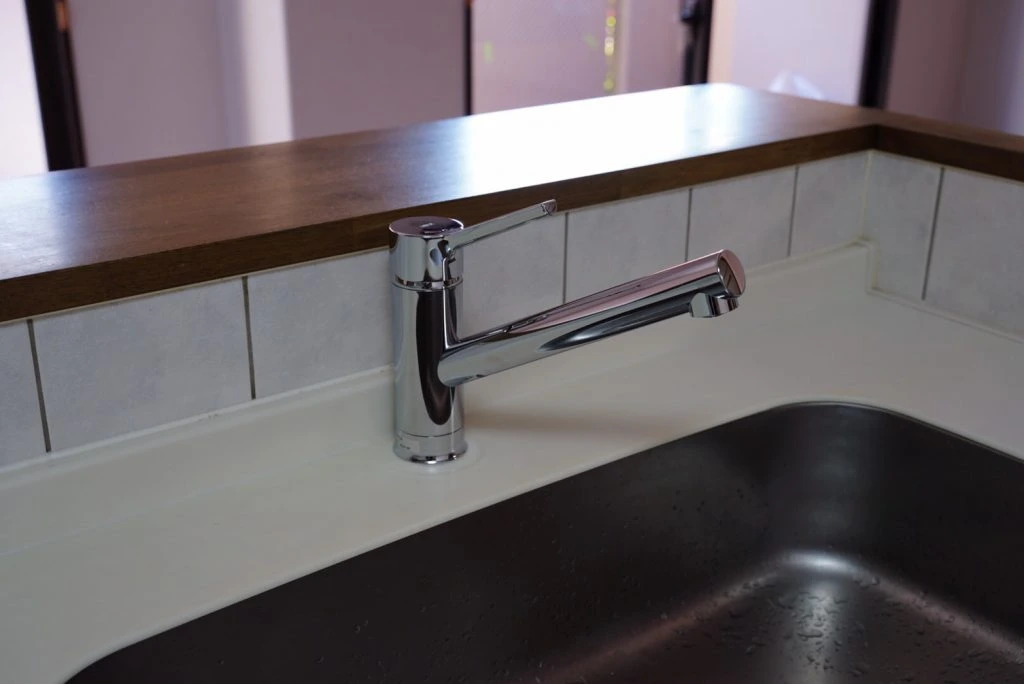 古くなったキッチン水栓のみを交換した事例になります。節水型のシングルレバー水栓で使いやすいと評判のものをお選びいただきました。