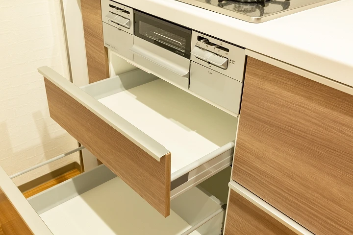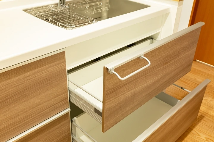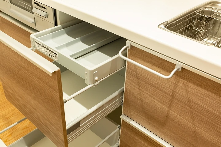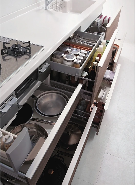 普段使うものは取り出しやすい場所に収納できるように、ミッテの引き出しは設計されております。他のメーカーのキッチンでは、高さのあるビンなどは、下段にしか収納できませんが、ミッテでは上段でも収納できるように設計されております。