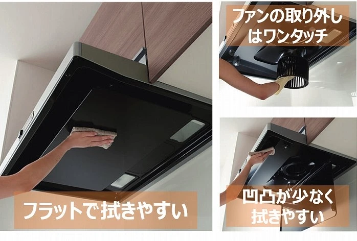 ミッテのレンジフードは掃除しやすいのが特長です。フィルターがないノンフィルター構造で、イヤな油汚れの手入れも簡単になりました。