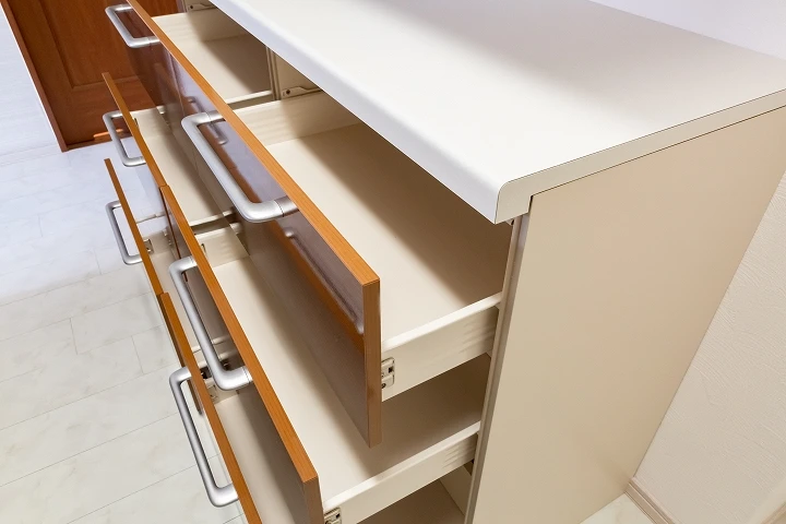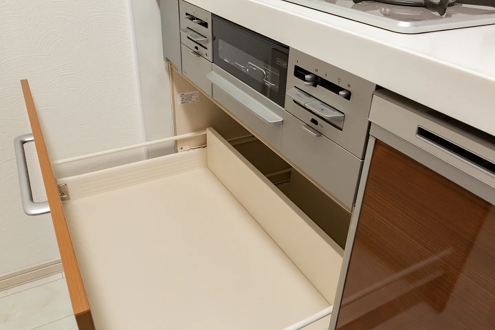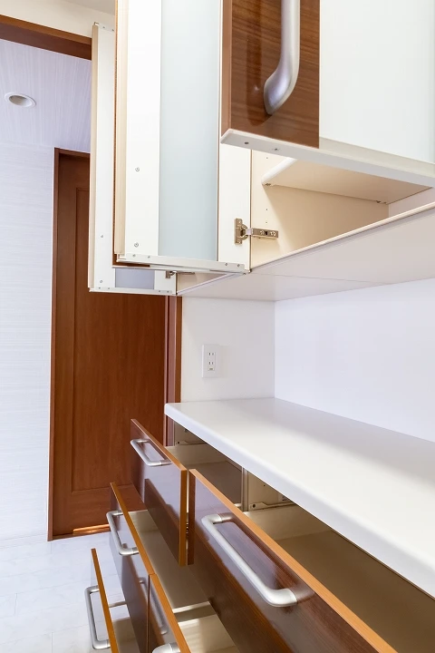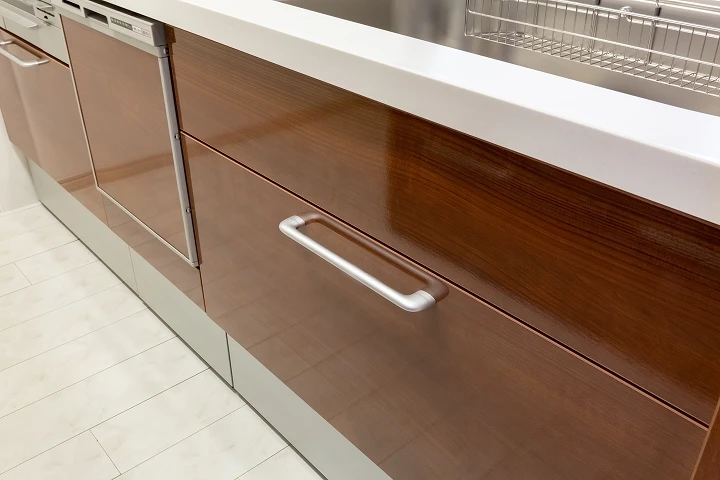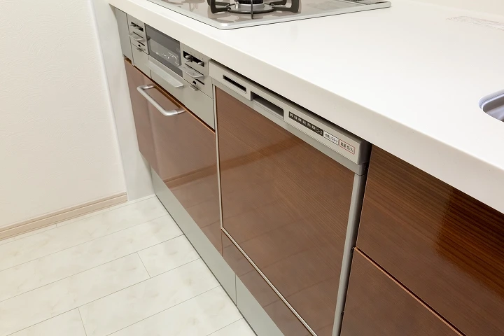 リクシルのキッチン「シエラ」へのリフォーム事例。使いやすさを追求したキッチンになっており、ビルトイン自動食器洗い機がついているほか、オプションのカップボードも設置されており、収納量も充実しております。