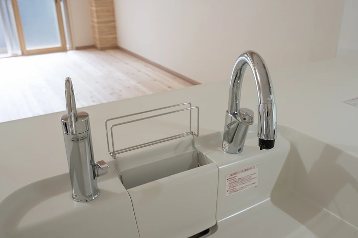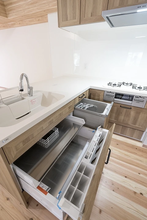 リシェルの特長は、「らくパッと収納」と呼ばれる、斜めに傾く扉がポイント。普段使いの道具がらくに、パッと取り出せる引出し収納が標準装備されております。また、引き出しの底板はステンレスでできており、臭いが付きにくく、長持ちします。