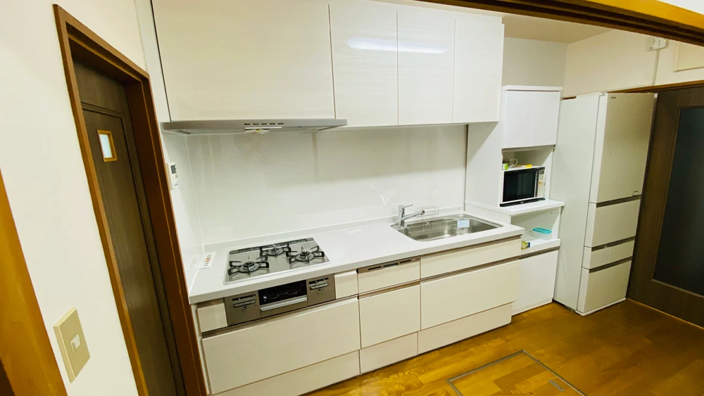 | 主なリフォーム内容 | キッチンは、リクシル「リシェル」幅225㎝ ※ダウンウォール付き吊り戸を設置 ※食洗機を新設(それに伴い、分電盤から新規回路を引く工事を実施) |