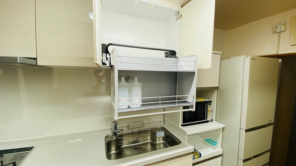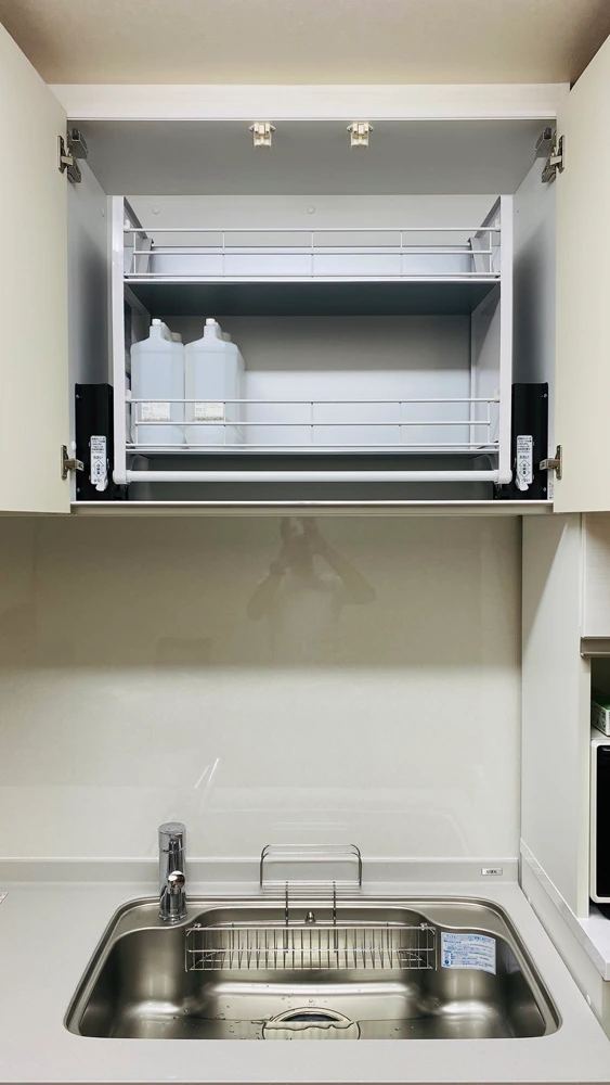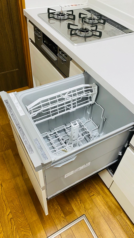 家族構成の変化に伴い、より使いやすいキッチンへとリフォーム。収納力アップ&食洗機の導入により、すっきりした作業台で気持ちよく料理ができるようになりました。吊り戸棚は「オートダウンウォール」を採用し、しまった物が取り出しやすくなりました。