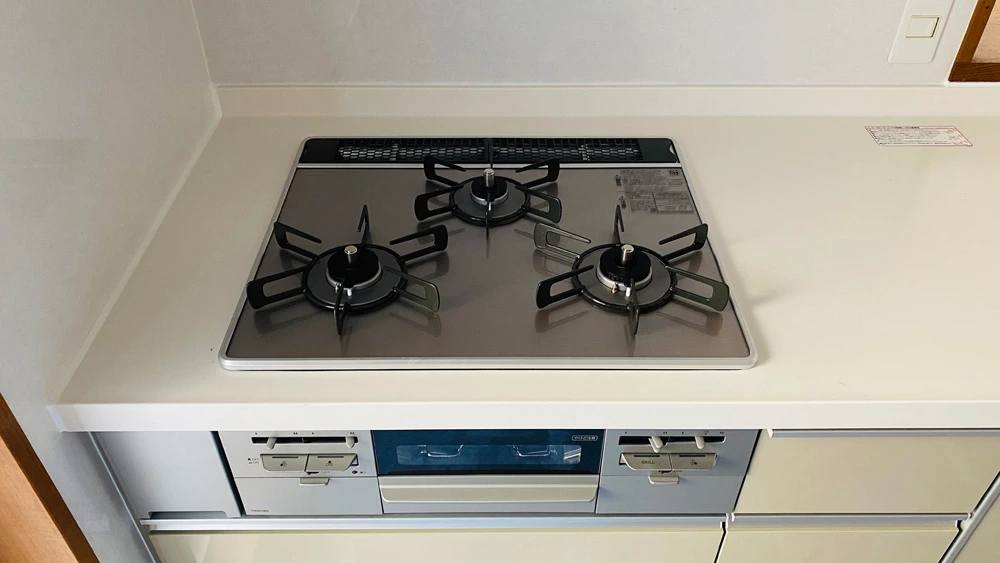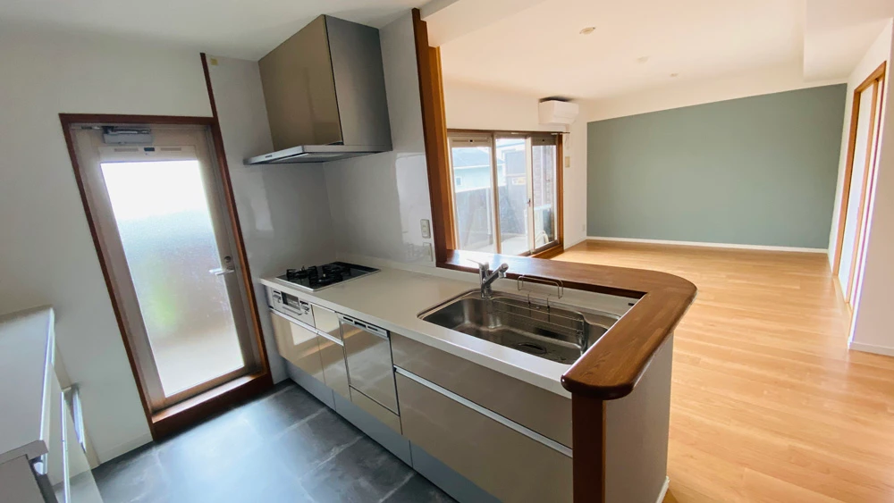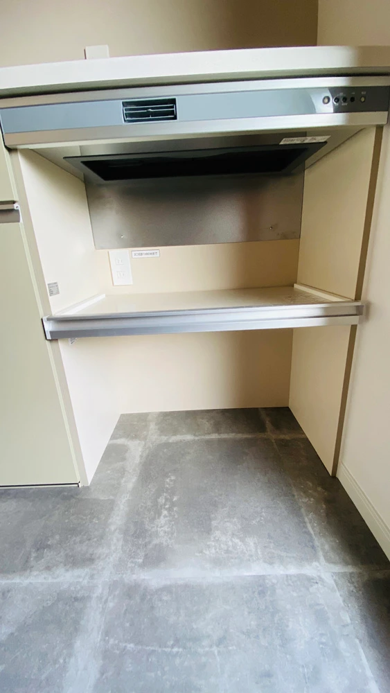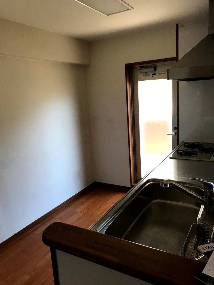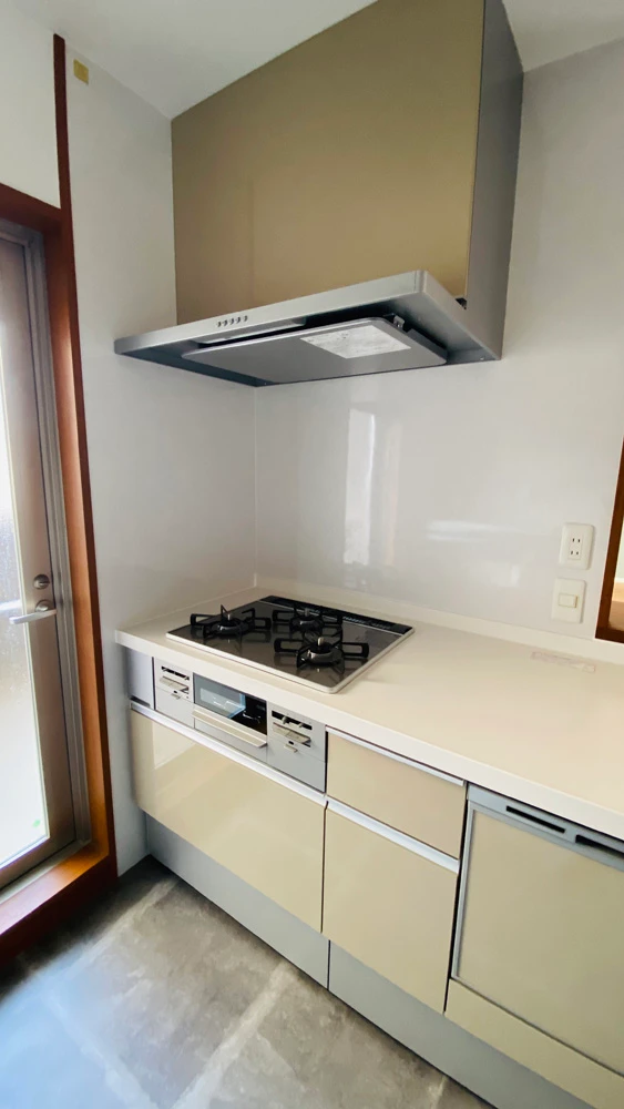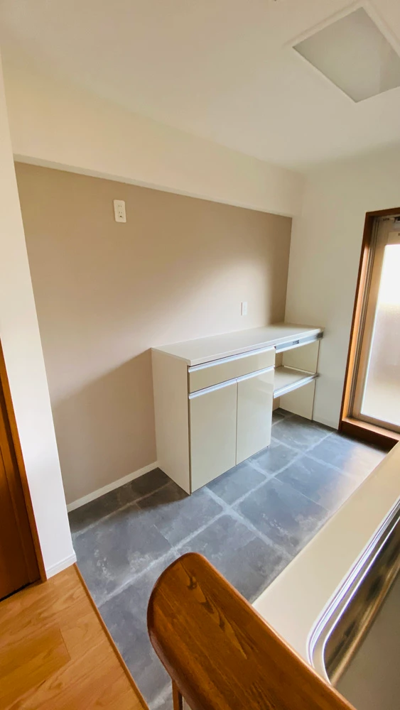 ご入居前のキッチンリフォーム事例です。システムキッチン入れ替えはもちろんのこと、システムキッチンと同ラインのリクシル「シエラ」でカップボードも導入、壁紙・床フロアタイル張替えとフルでリフォーム工事を行いました。システムキッチンとカップボードを同ラインで揃え、デザイン的統一感はもちろんのこと、家事導線がスムーズで使いやすさは抜群です。床はフロアタイルを採用し、おしゃれな雰囲気でありながら水汚れを防げるようになっています。