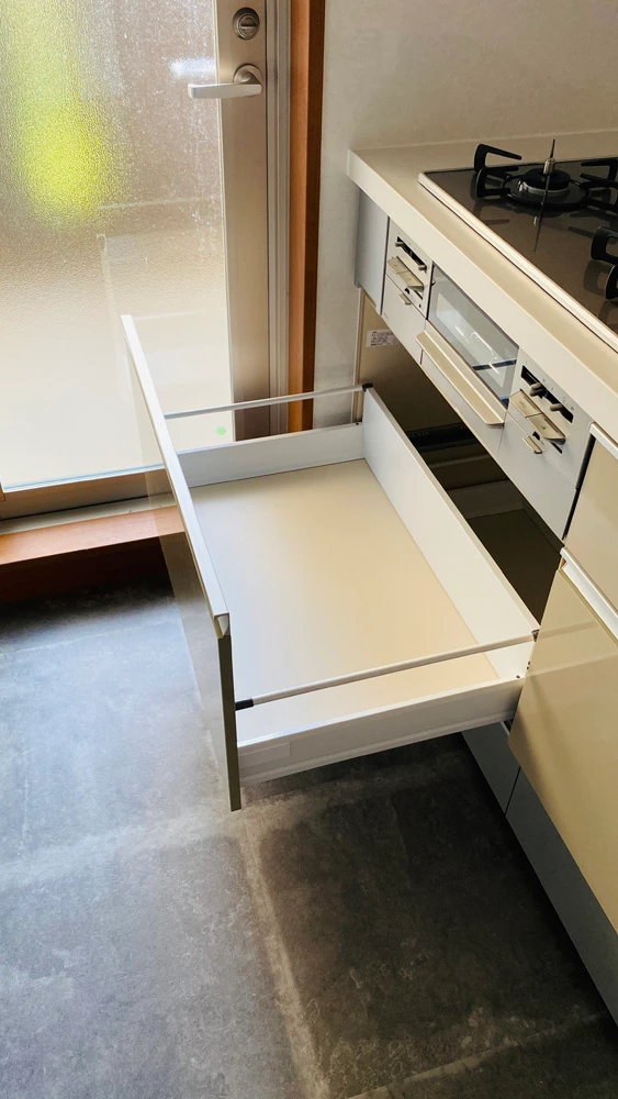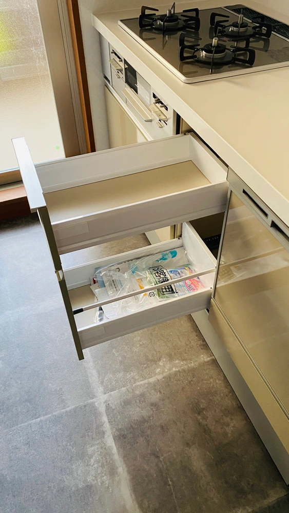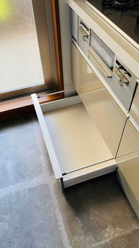 今回、収納はコンロ下やシンク下でも二段引き出しになっているスライドストッカーのキッチンにしました。鍋やフライパンなどの調理器具や、調味料など全て収納できるだけの収納スペースがあります。