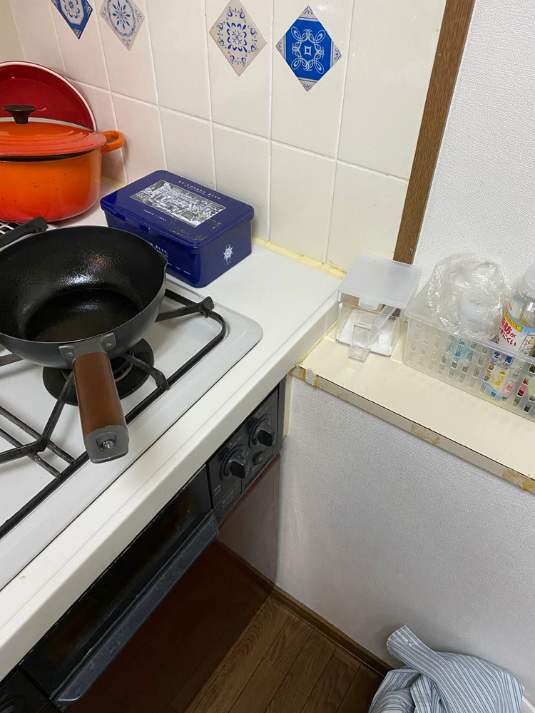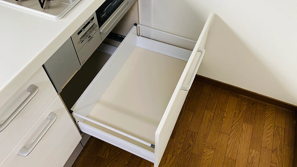 キッチンのキャビネット自体の長さは200㎝弱と小さなものになりますが、蹴込み部分も引き出し収納になっているスライドストッカープランのため、以前より格段に収納量が増えました。
