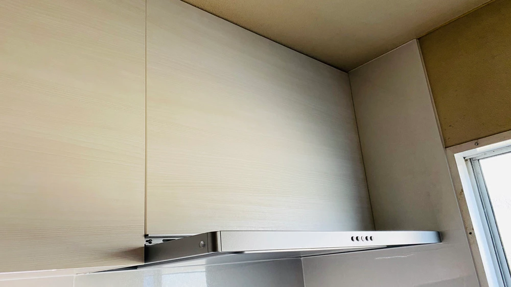 もともとプロペラファンでしたが、換気は悪いのが問題でした。今回、下から吸い上げるシロッコファンにすることで換気を良くしました。外部は、専用の部材でカバーし、ベンドキャップで仕上げました。