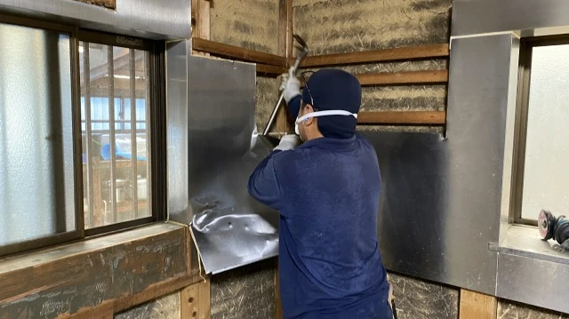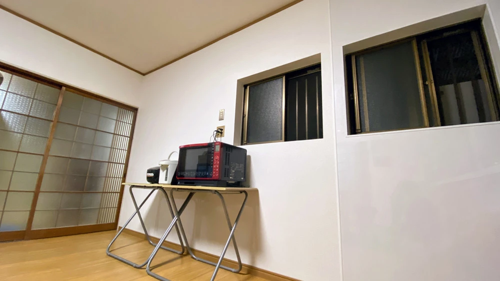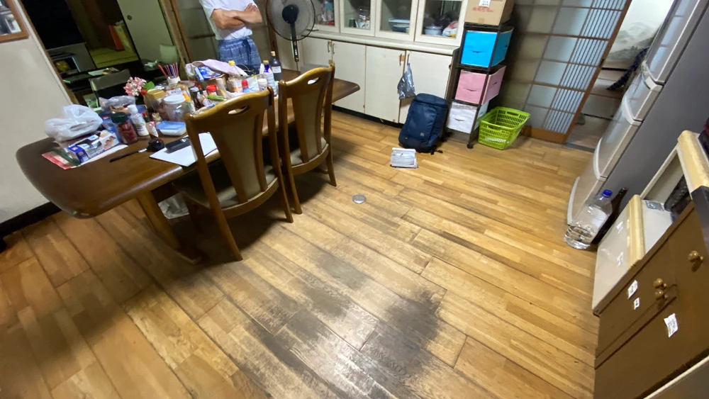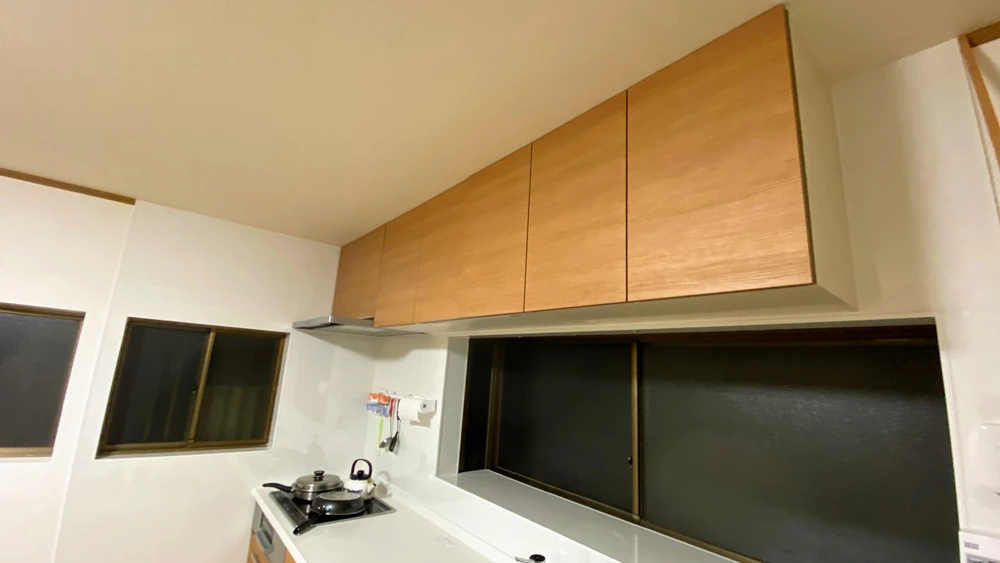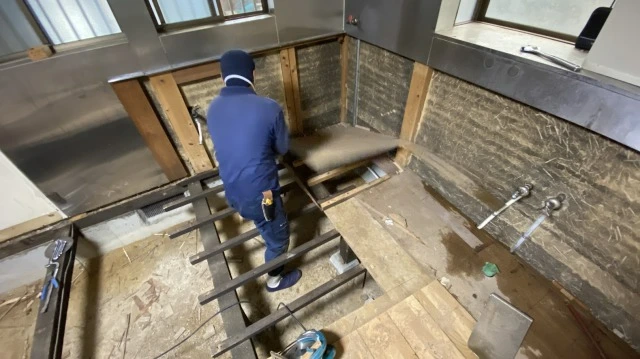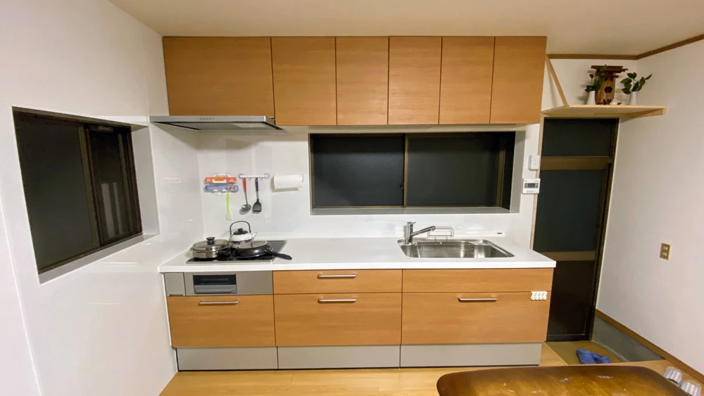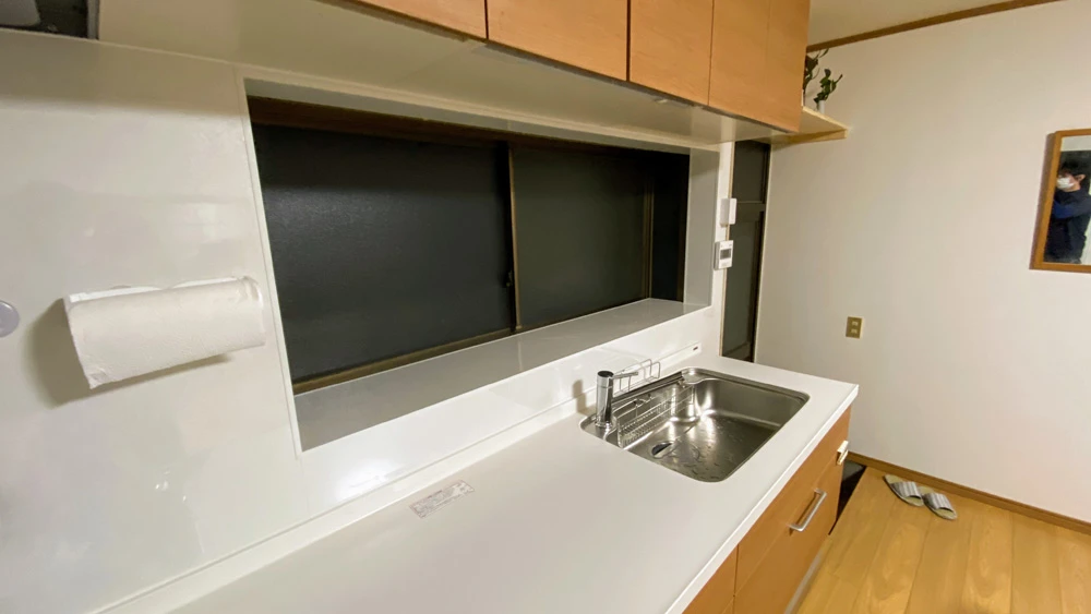 キッチンは老朽化しやすい箇所の一つで、今回はフローリングの張替えも同時に行いました。天井・壁のクロス張り替えは、そのままではクロスを貼ることができない状態だったので、ベニア板で下地を作り直して可能にしました。