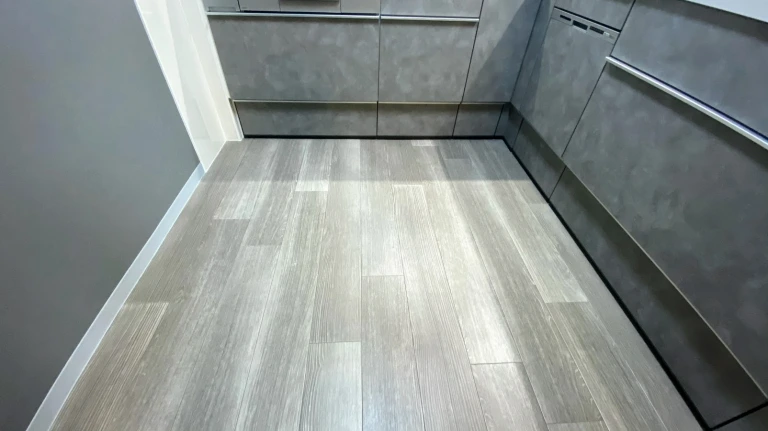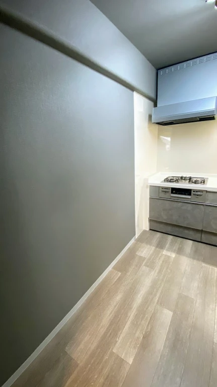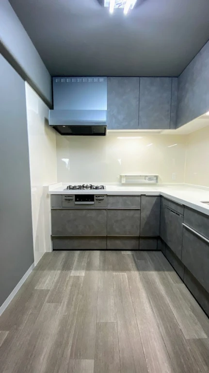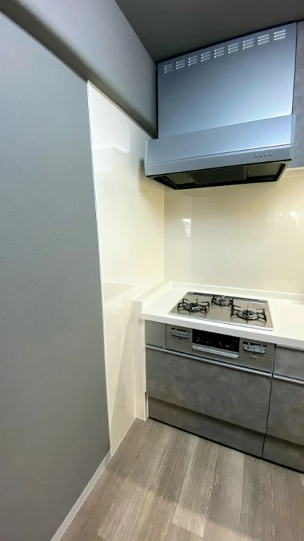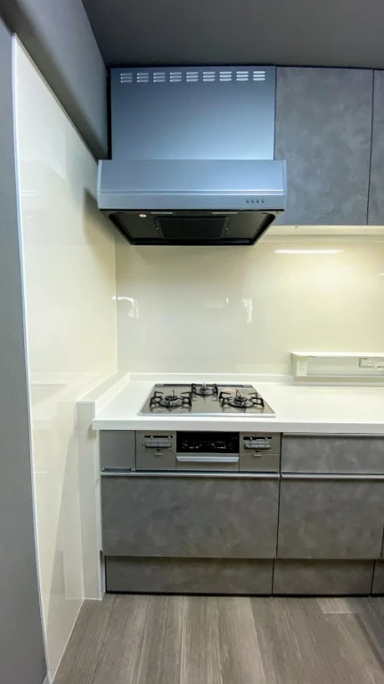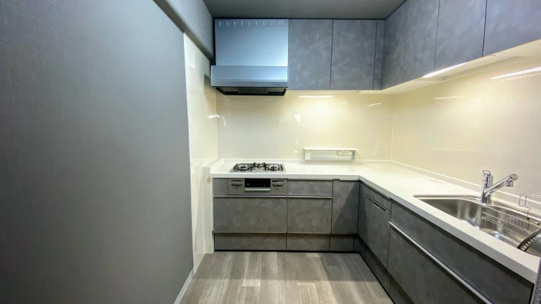 システムキッチンのカラーリングに合わせて、壁紙とクロスもクールなグレー系でまとめました。狭い空間に統一感が生まれ、すっきりとした印象になりました。