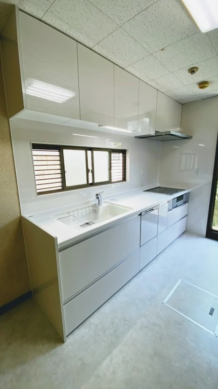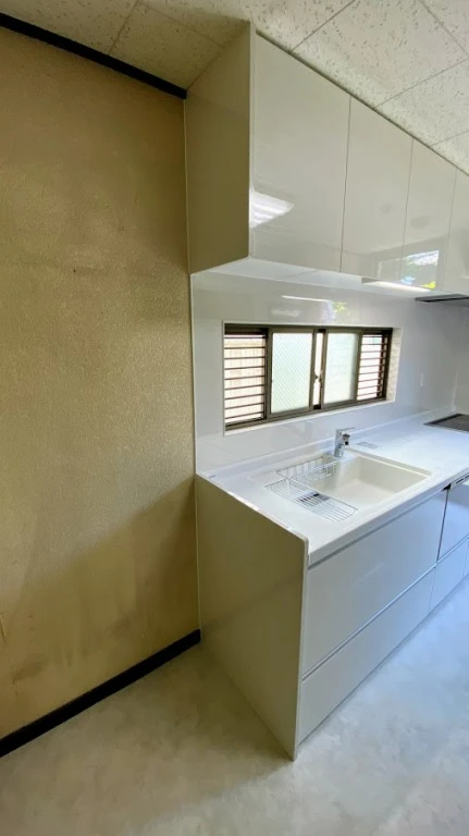 システムキッチンの入れ替えに合わせ、床の張り替えも行いました。扉のカラーに合わせたアイボリー系の淡い色を合わせ、清潔感のあるキッチンになりました。