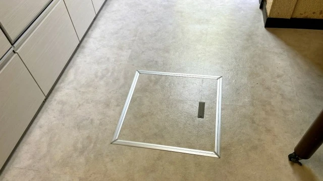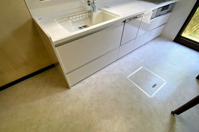 キッチンと色のトーンを揃えたアイボリー系のフロアタイルに張り替え、清潔感のあるキッチンになりました。