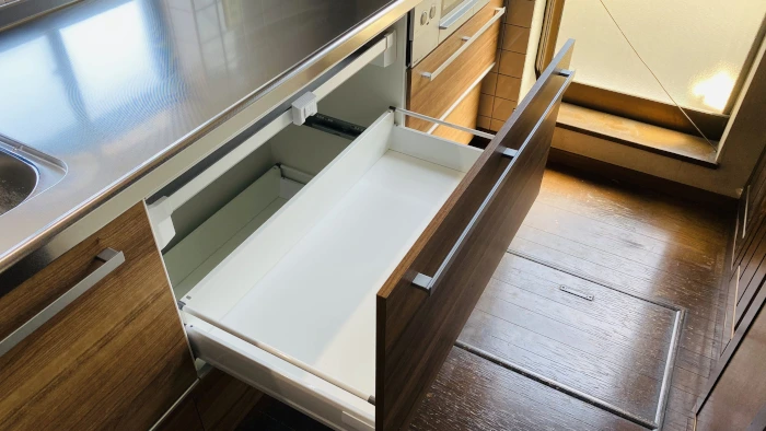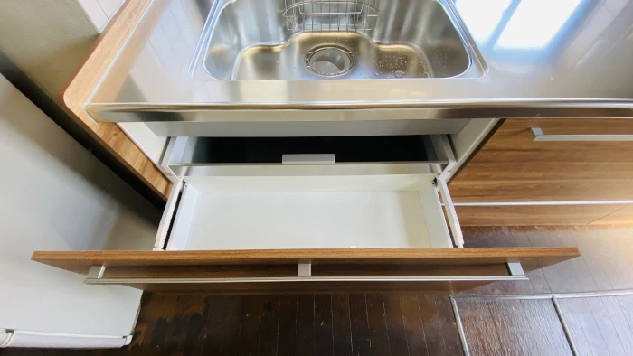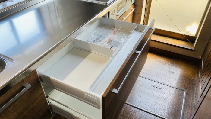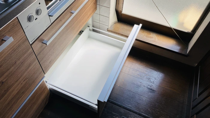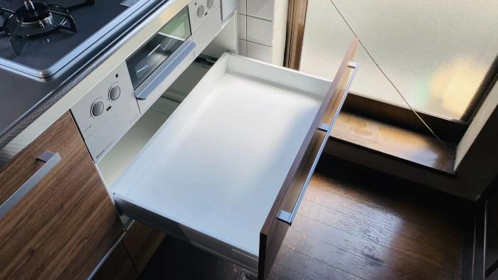 ラクエラの特徴のひとつに、たっぷりの収納があります。キッチンまわりに調理器具がごちゃつかず、すっきりした印象のキッチンになります。シンク真下の引き出しはステンレス底の引き出しになっており、さらに清潔に使っていただけます。