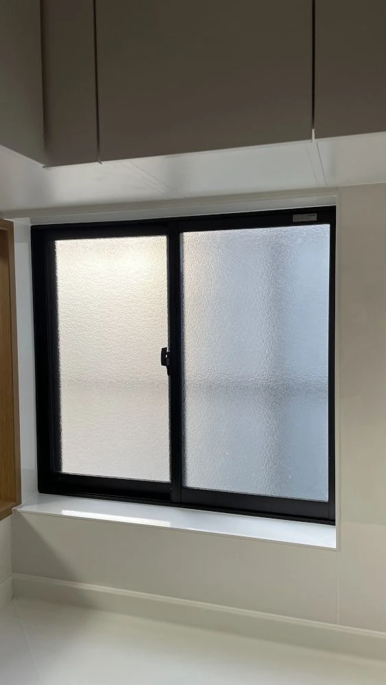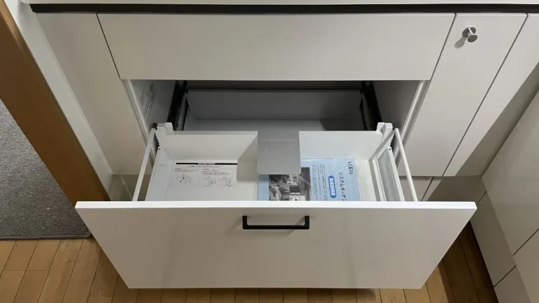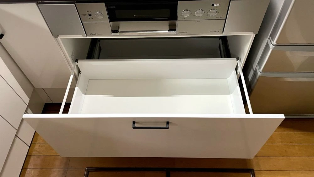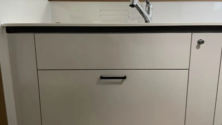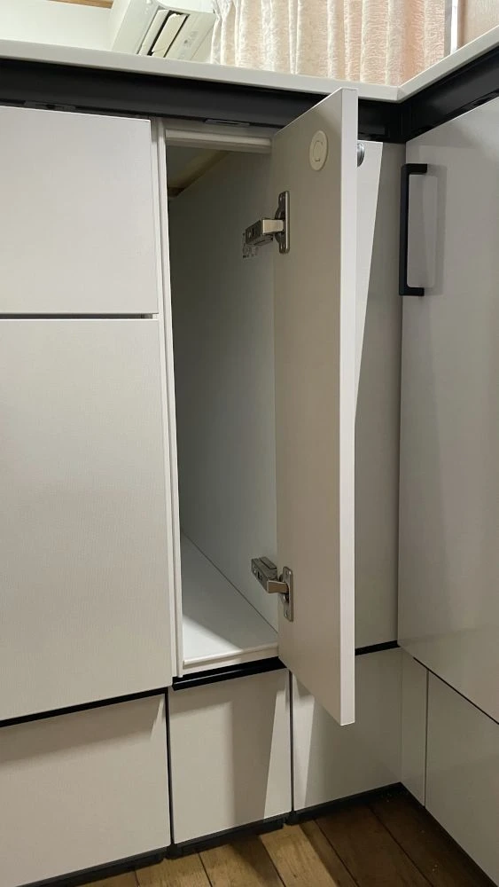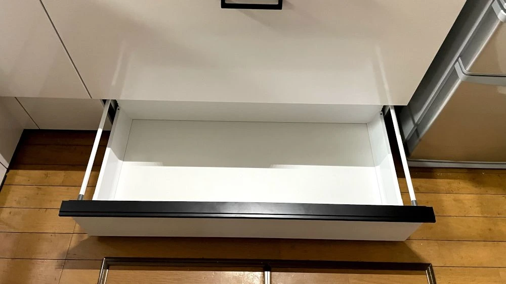 吊戸棚の高さを調整し、高い場所に収納したキッチン用品が取り出しやすく便利になりました。オプションでシャープな薄型人造大理石ワークトップにグレードアップし、使い勝手だけでなく見た目もお客様思い通りのキッチンが完成しました。
