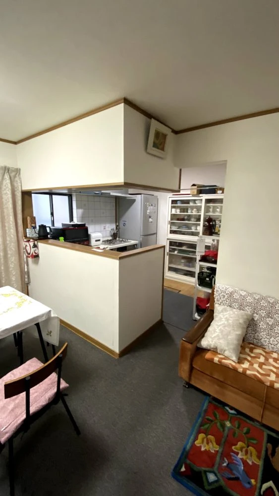 | 主なリフォーム内容 | キッチンは、リクシル「シエラ」(L型180㎝×180㎝) ※ワークトップをスリムなカウンターにグレードアップ ※レンジフード、コンロは再利用 |