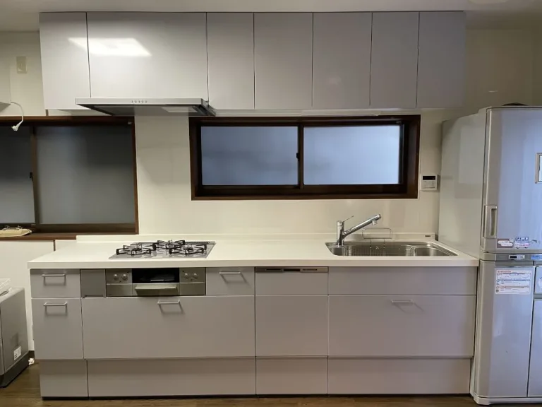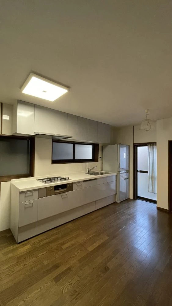 新しいキッチンは明るい色味のカラーリングで明るく清潔感があります。LDKの天井と壁のクロスも張り替え、すっきりと明るいLDKになりました。