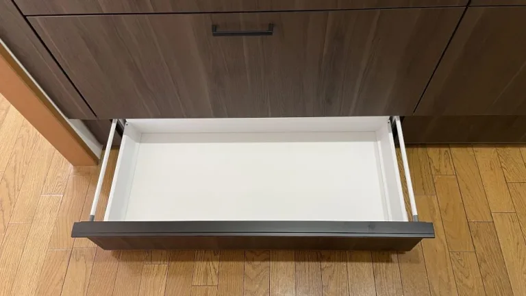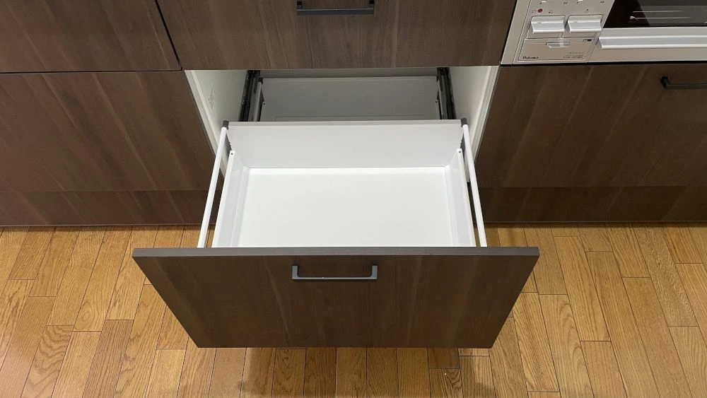 最新のキッチンの特徴の1つとして、キャビネットが引き出し式になったことで収納効率が上がっている点が挙げられます。新しいキッチンにリフォームする際に吊り戸棚を撤去しすっきりとしたキッチンにすることも可能です。引き出し式の収納は奥まで効率的に利用できるので収納力はそれほど変わりません。