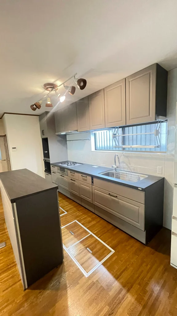 リクシルのハイグレードキッチン「リシェル」にリフォームした事例になります。リシェルは豊富な収納量が特長です。今回はコンロは再利用。カップボードも同じく「リシェル」で統一感あるキッチンになりました。