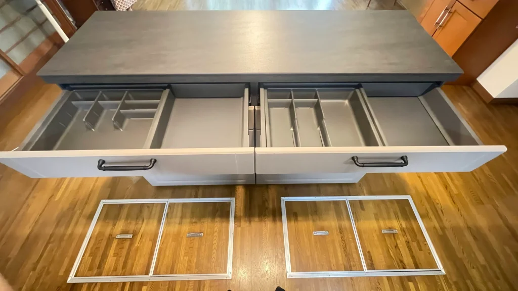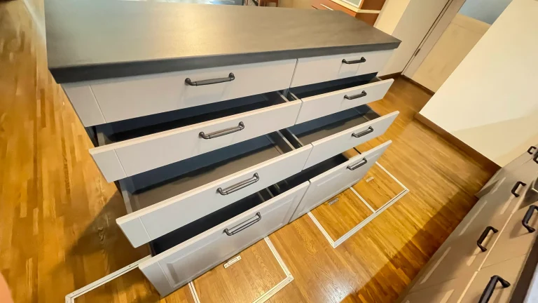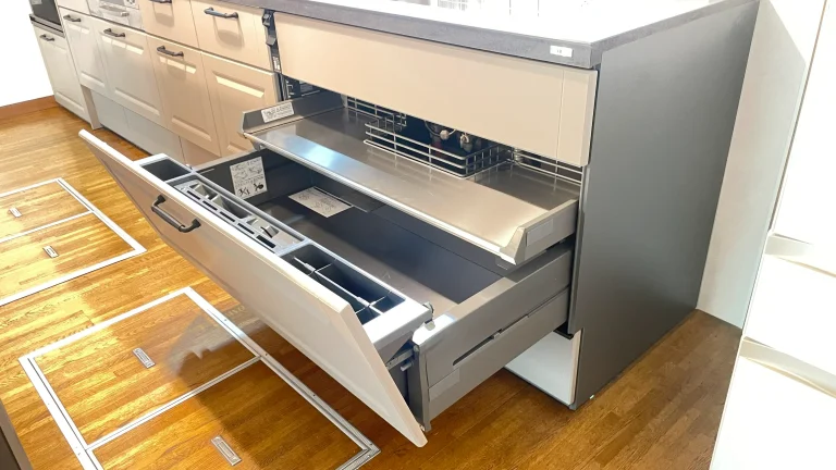 リシェルの特長は、優れたデザイン性と、「らくパッと収納」と呼ばれる、斜めに傾く引き出し。標準装備のこの収納は、片手で楽にキッチン道具を取り出すことができます。また、引き出しの底板はステンレスでできており、臭いが付きにくく、衛生的です。