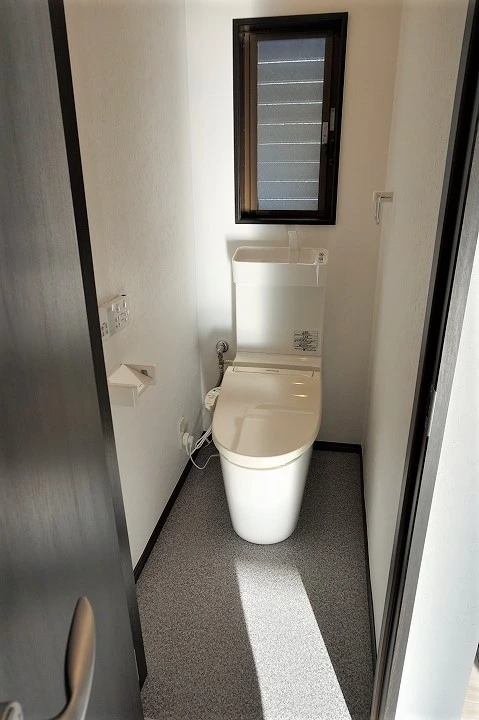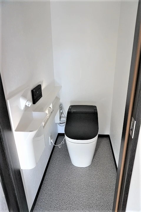 トイレは清潔感を出すために白くすることが一般的ですが、あえて黒いフタを採用することで、オシャレな空間を演出しています。手前に手洗いを設けることで子供でも簡単に手が洗えるようにしています。トイレは掃除がし易いように凹凸の少ないタイプを採用しました。