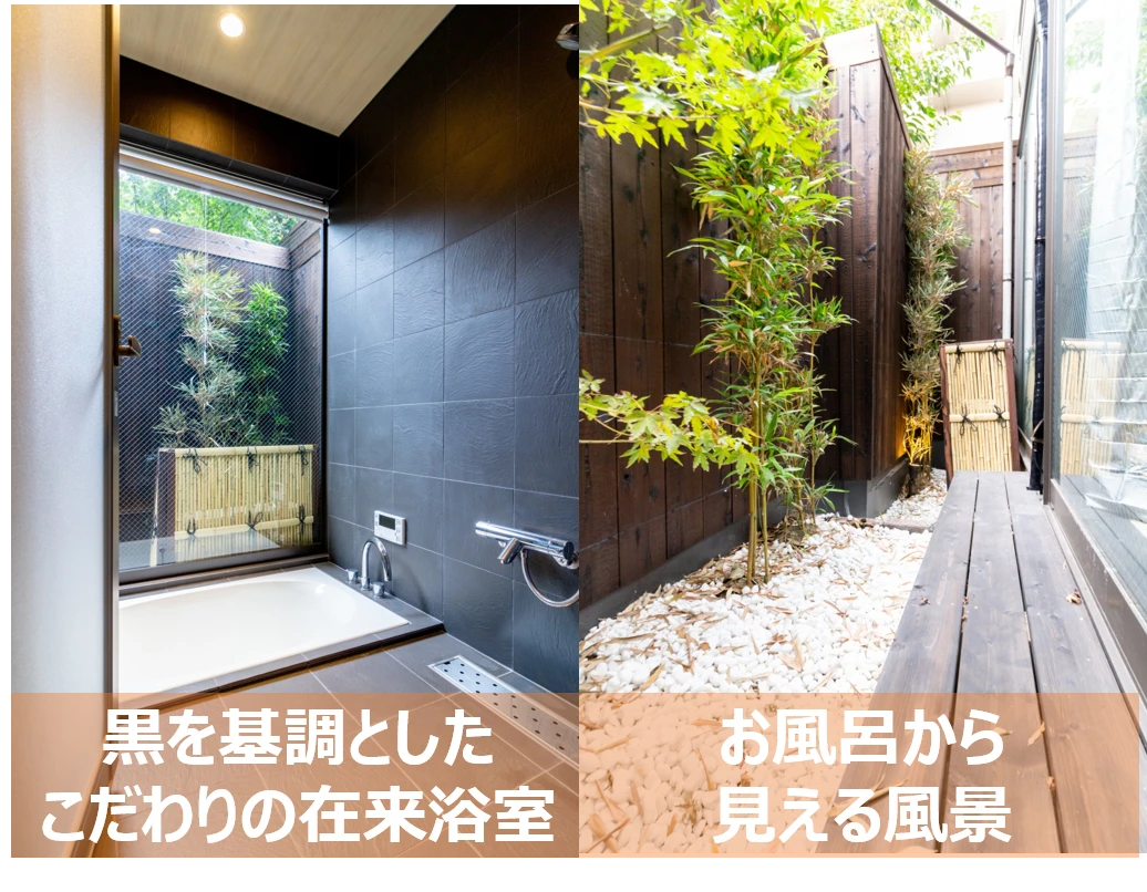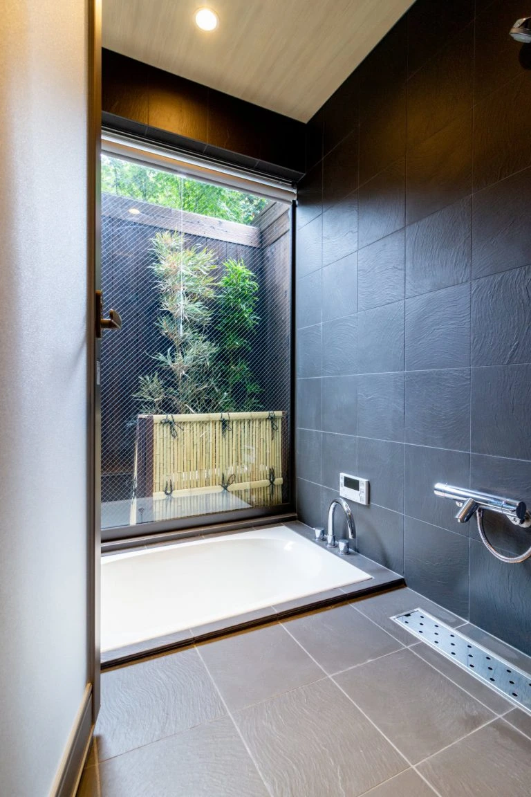 黒を基調とした在来浴室にすることで高級感を演出したほか、一面をガラス窓にすることで、露天風呂の雰囲気を味わうことができます。