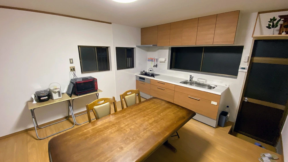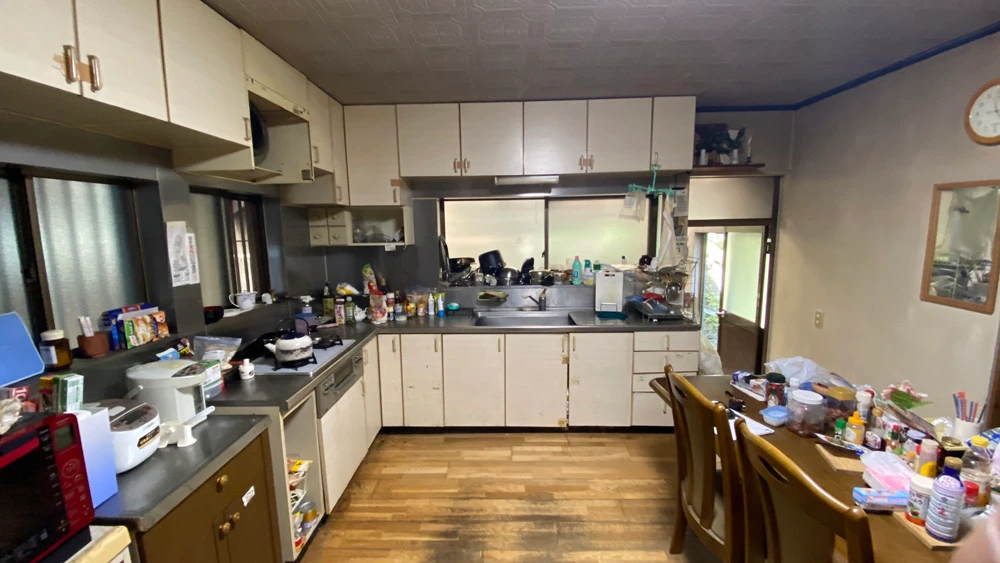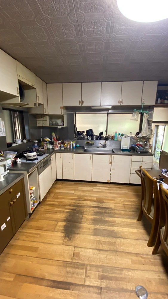 | 主なリフォーム内容 | ■キッチン・ダイニング改装工事 システムキッチン交換 ガスコンロ→IHヒーターへ変更 フローリング張り替え 内装工事 ■浴室・洗面所改装工事 ユニットバス交換 洗面化粧台交換 内装工事 ■トイレ工事二箇所 ①トイレ交換 ②和式⇒洋式トイレ工事(2個室→1個室へ改装) 天井・床・壁内装工事 トイレ設置 ■給湯設備交換工事 エコキュート設置 設備下地補強 |