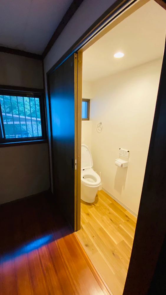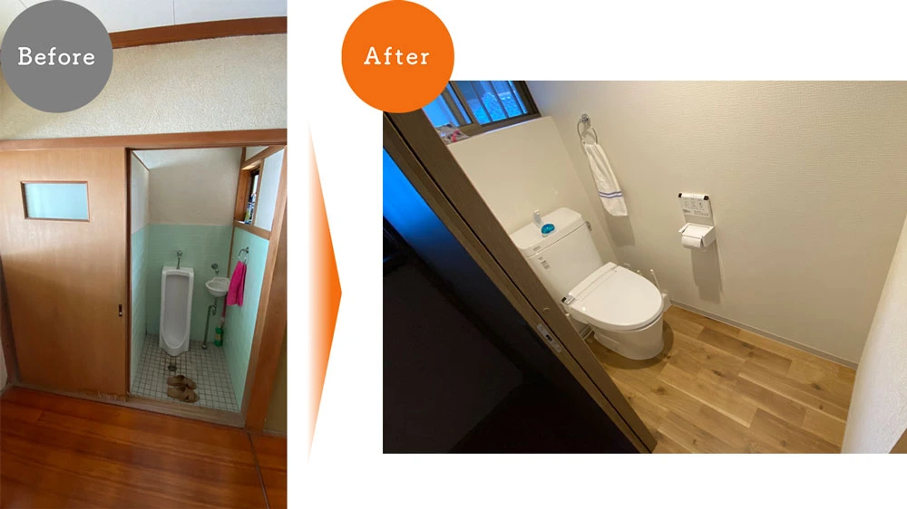 今回、トイレは二箇所施工しました。うち1カ所は、和式トイレ男女用がそれぞれ設置された、小さな個室×2でした。それを個室一室へ間取り変更し、空間面積を広げて洋式トイレを設置しました。体に負担のかかりにくい洋式トイレになり、また、空間が広くなってとてもご満足いただけました。