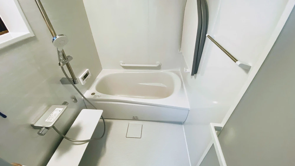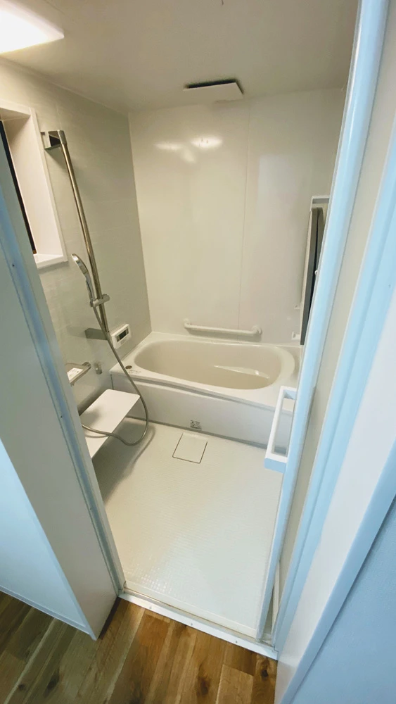 既存浴室はタイル張りで、冷気が伝わりやすく湿気がこもりがちなものでしたが、ユニットバス導入によりお手入れしやすく断熱性の高いものに。床・天井・壁と浴槽の色味をホワイトで統一し、見た目のスッキリさもアップしました。