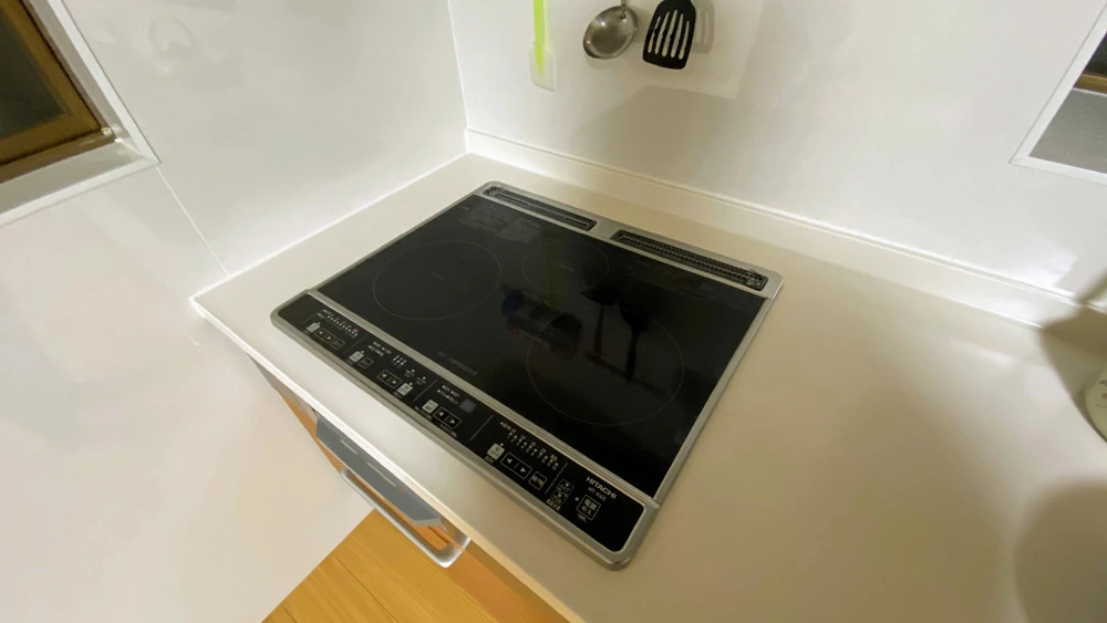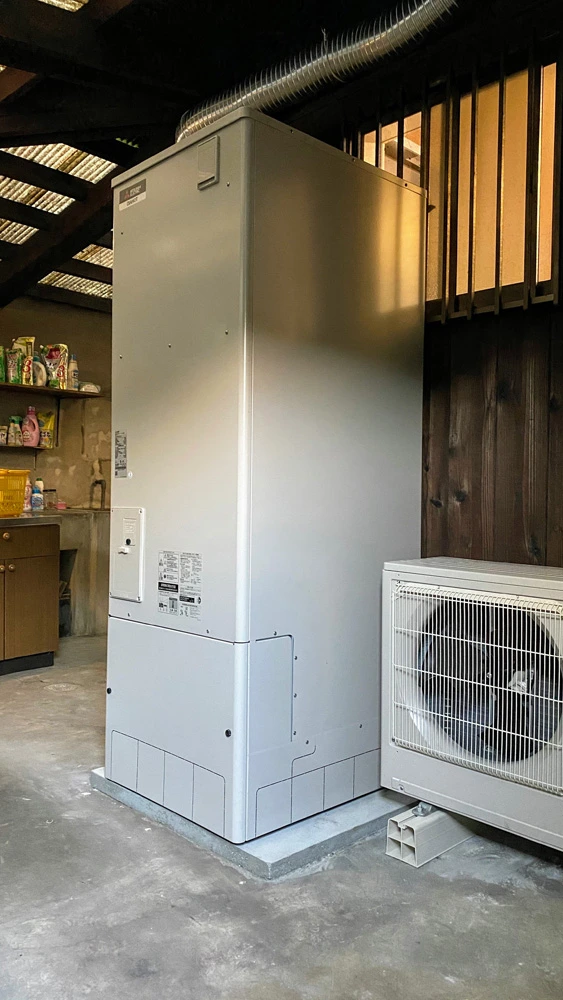戸建てオール電化工事の施行例です。設置面を補強してエコキュートを設置し、キッチンはガスコンロからIHヒーターへ変更するなど、オール電化住宅へと生まれ変わりました。