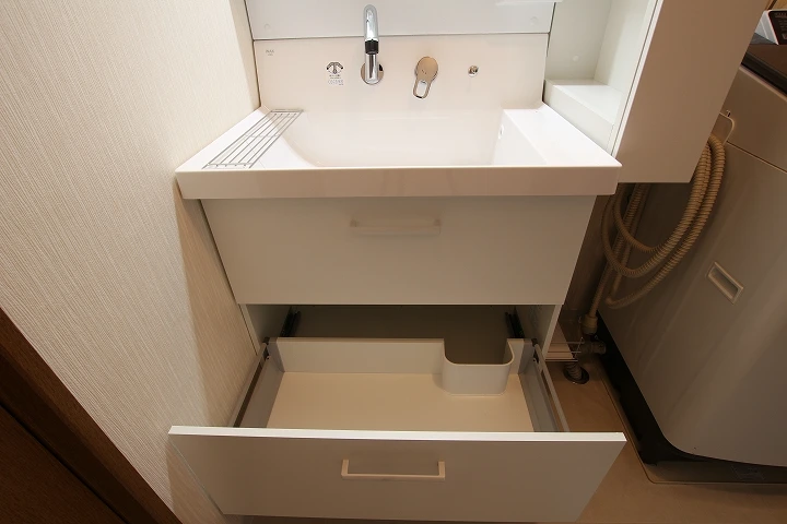 従来の洗面化粧台と最近のもので大きく違う収納部分。まず、観音開きで一段しかない収納から、引き出しスライド式がスタンダードになっています。排水管を避けたカッティングで、奥の収納に手が届くよう設計されています。