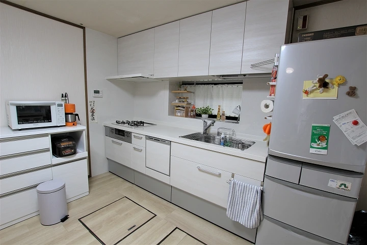 | 主なリフォーム内容 | ■キッチン ・システムキッチン入れ替え リクシル「シエラ」255㎝ ・食洗機新規設置/浄水器付き水栓/ガラストップコンロ/昇降機付き吊り戸などのオプション付き ■浴室 ・ユニットバス入れ替え リクシル「アライズ」戸建て用1616サイズ ・アライズ内で最上級のKタイプを採用 ■洗面所 ・洗面化粧台入れ替え リクシル「ピアラ」間口75㎝ ・内装工事(クロス・クッションフロア張替え) |
