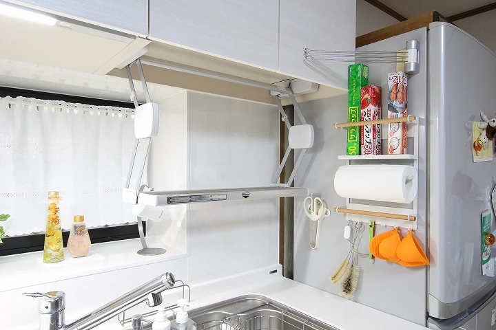 浴室はより広さが感じられるよう、ミラーを横長に設置。キッチンは昇降機付き吊り戸棚やちょっとした洗い物が置ける水切りなど、日々の生活をより快適にするオプションを追加。洗面化粧台リクシル「ピアラ」は、最小限の間口でもボウル部分ひろびろ設計の優れものです。