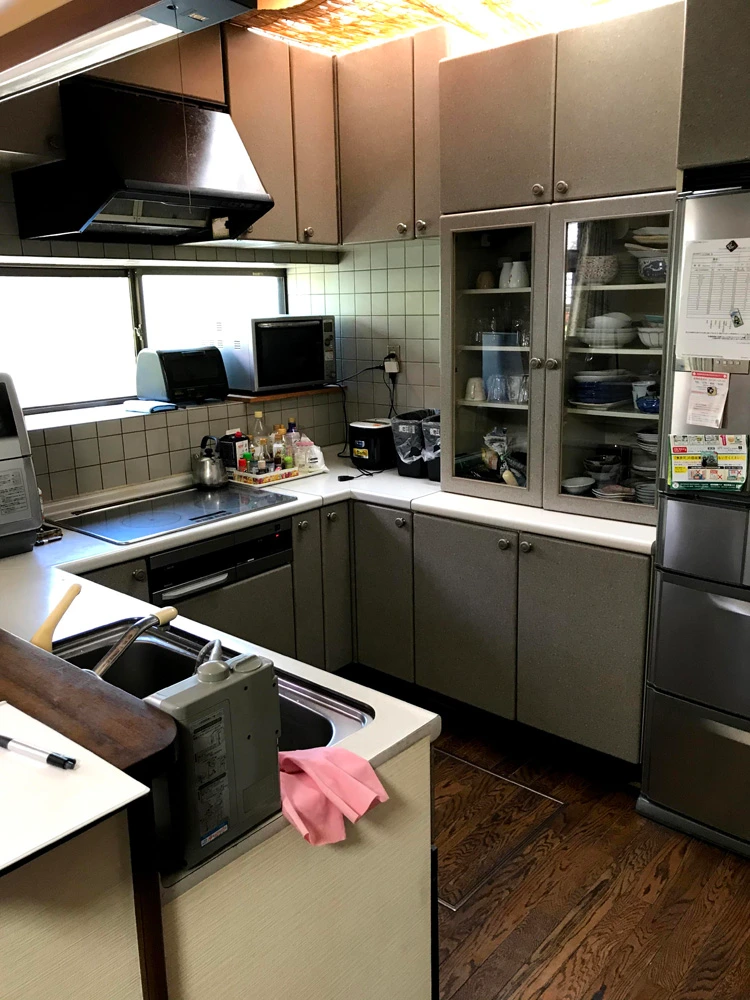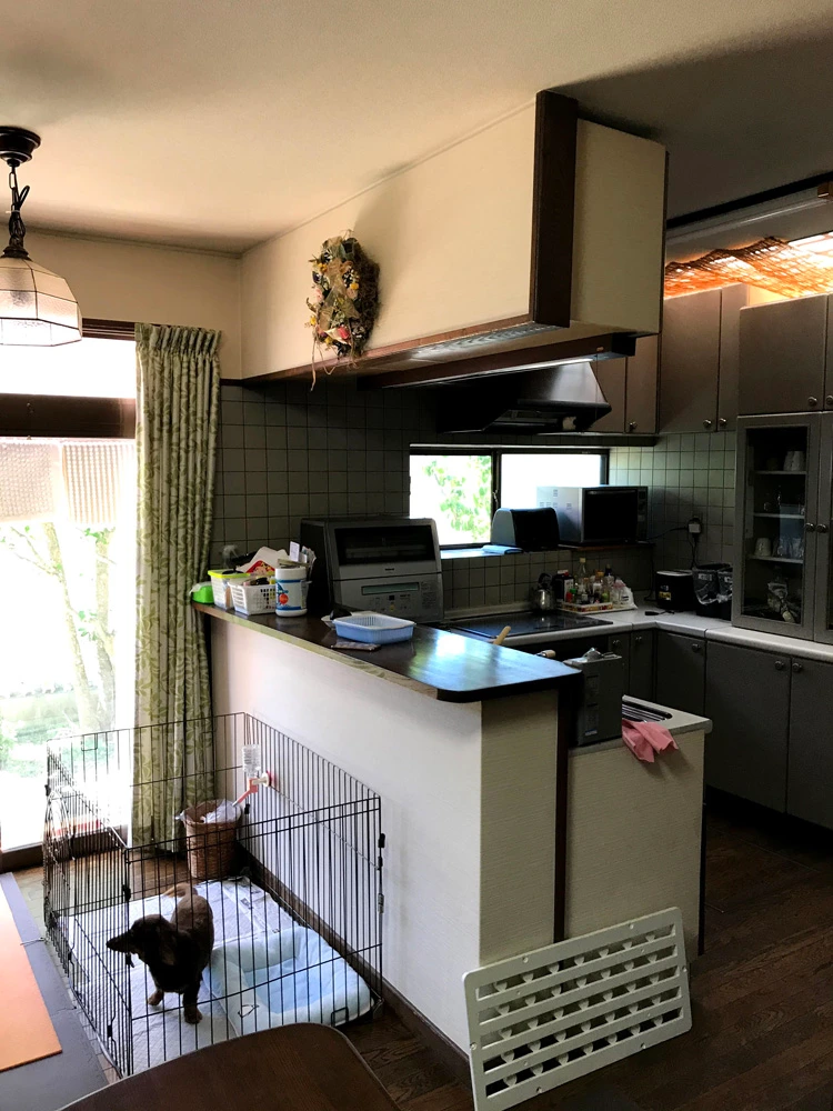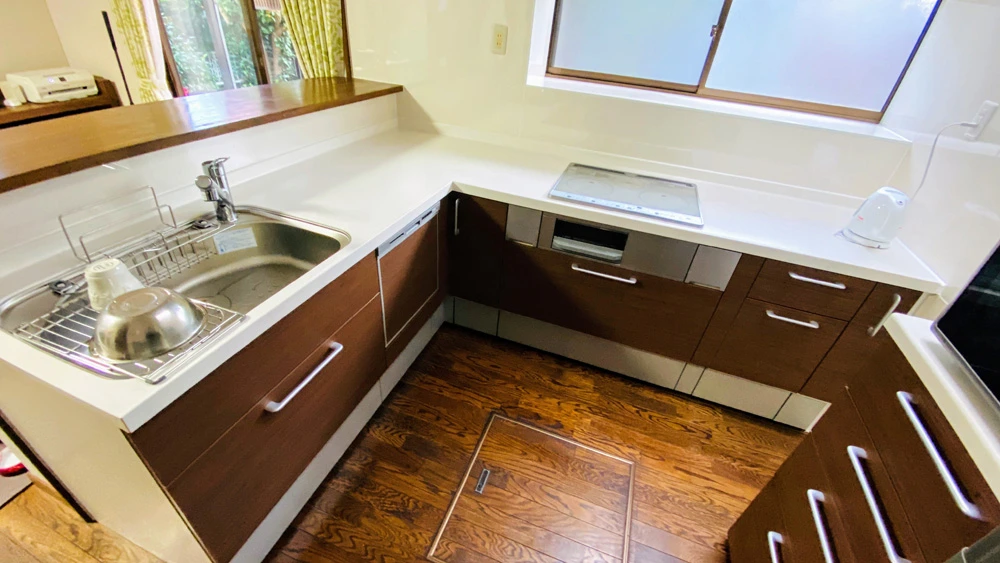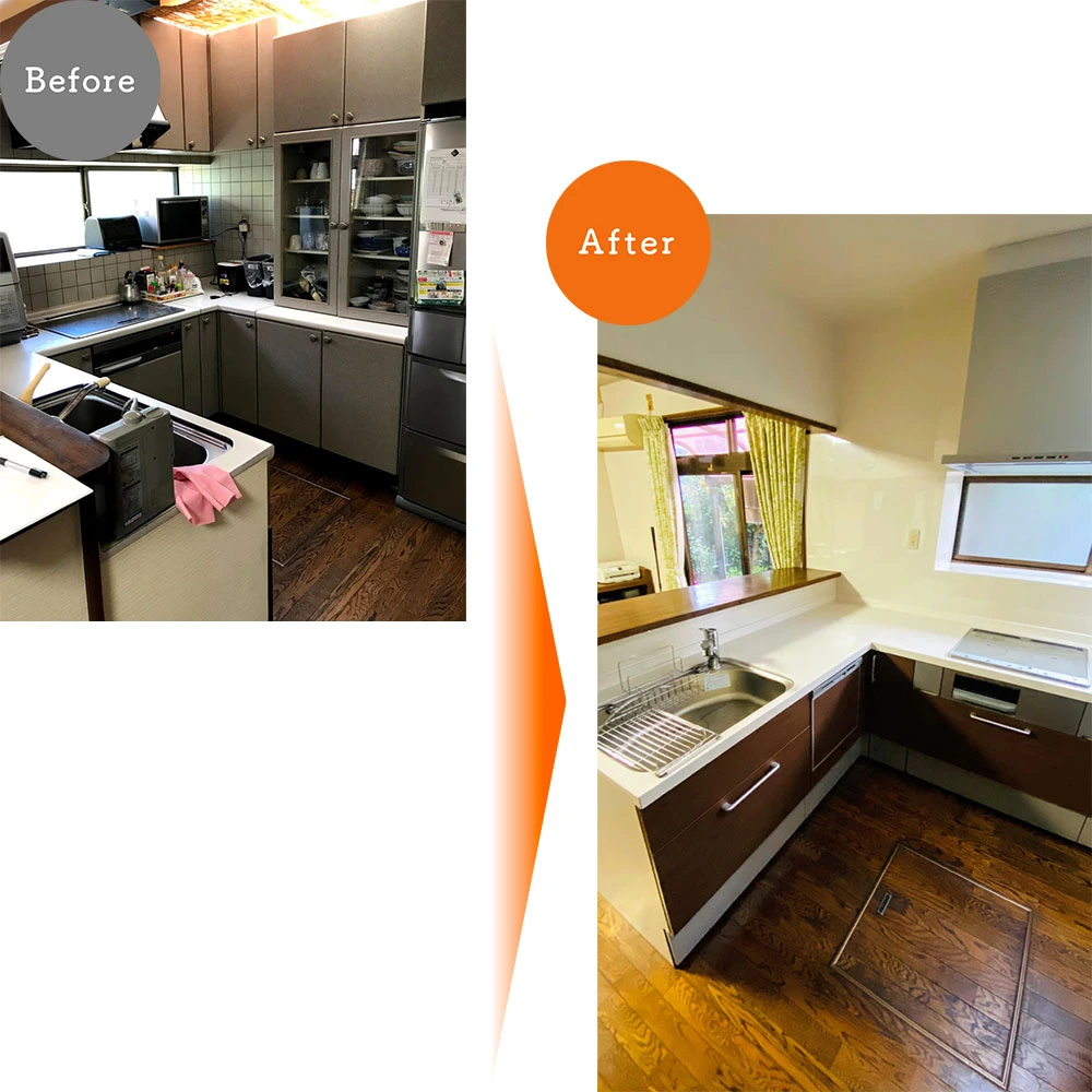 プチ間取り変更で、コの字型キッチンからL字型キッチンにリフォームしました。吊り戸棚は撤去し、視界が広くなってより開放的なキッチンに。食洗機導入で家事負担を軽減も!