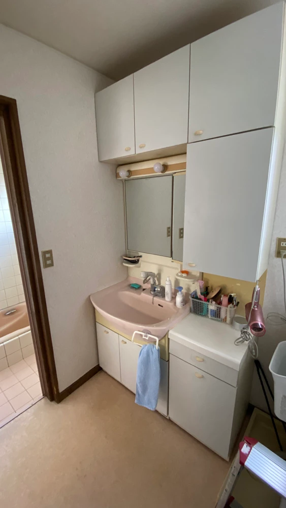 キッチン同様、洗面所の吊り戸棚も撤去し、開放感ある空間へ。