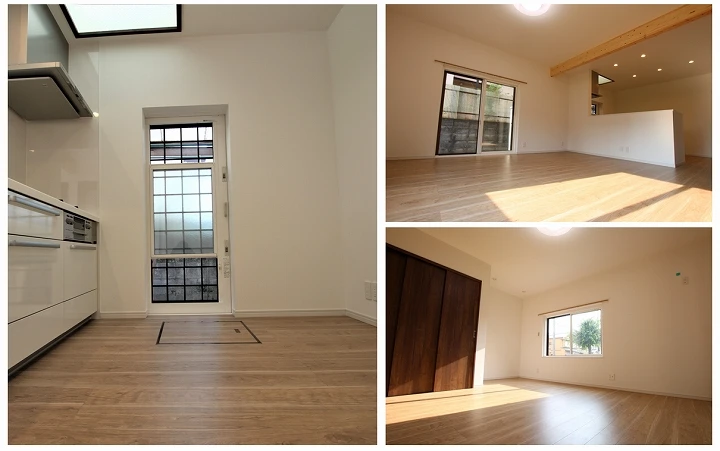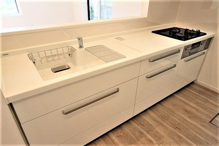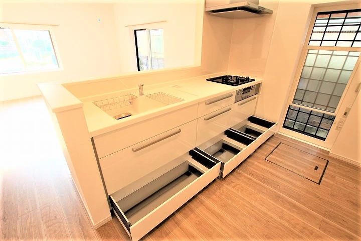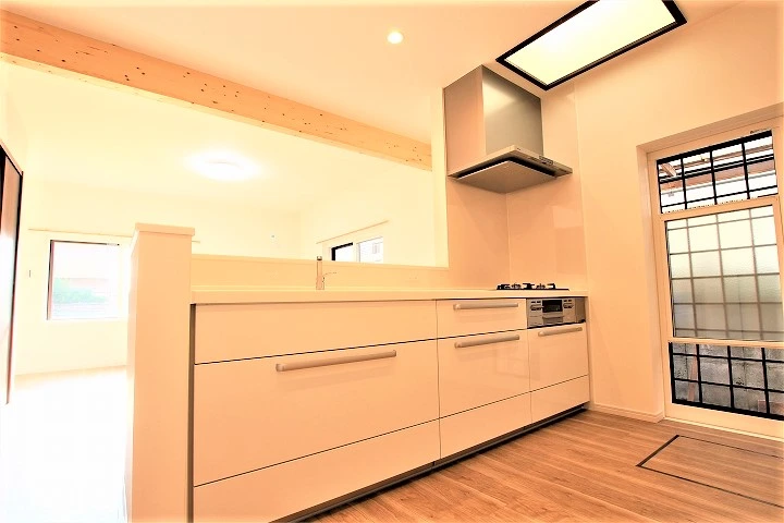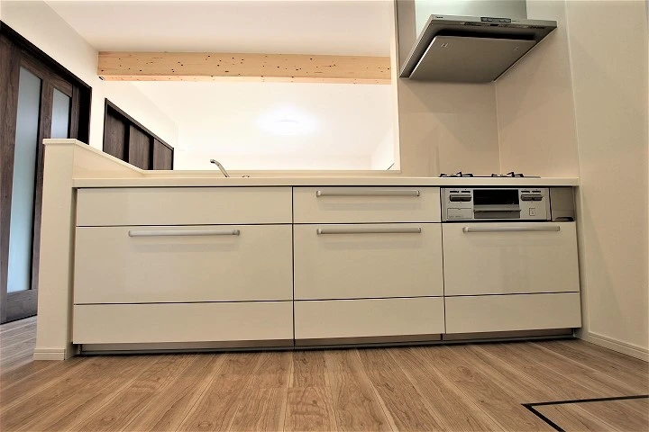 老朽化に伴うLDKリフォームになります。もともとは、キッチンダイニングと居間を壁で隔てた間取りでしたが、今回のリフォームで間仕切り壁を取っ払い、壁付のキッチンを対面式にすることで、今風の間取りのLDKになりました。