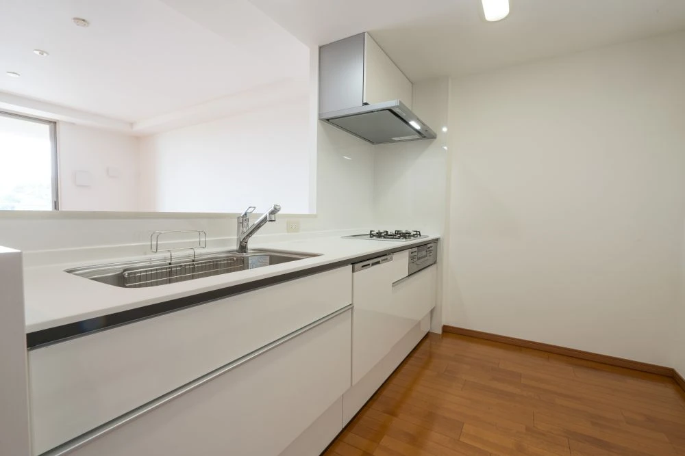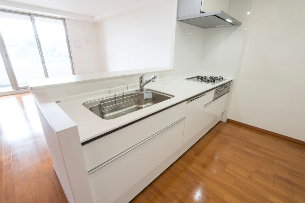 窮屈だったキッチンは垂れ壁・袖壁を撤去し開放的なオープンキッチンに。リビング側も抜け感が出て広い印象になりました。腰壁上のカウンターもキッチンに合わせたホワイトに交換しています。