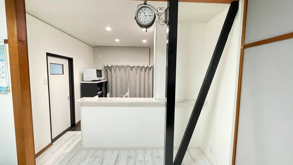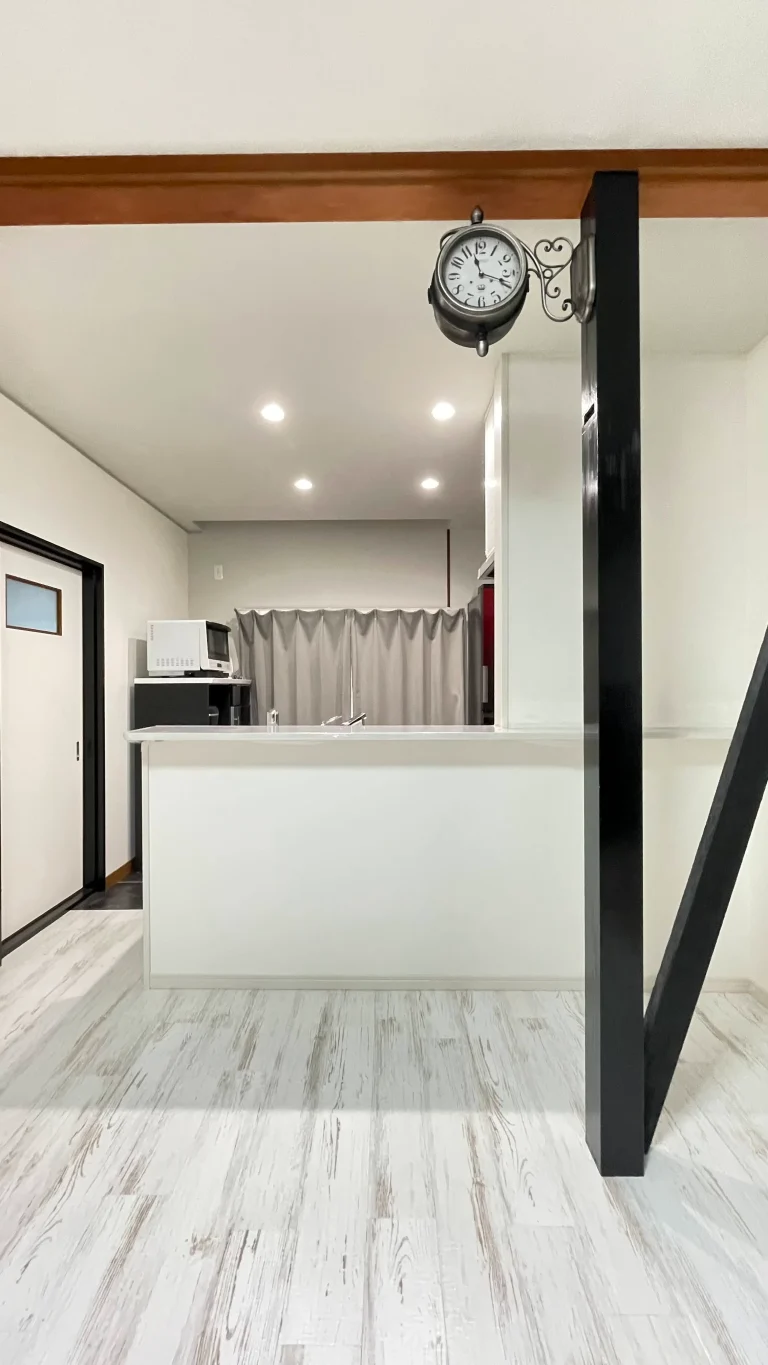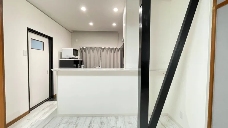 家屋の強度を維持するために筋交を残して、居間と台所を隔てていた壁は撤去。広いLDKとして利用できるようになり、リビングを見渡せる対面キッチンも実現しました。