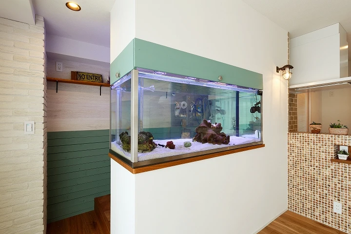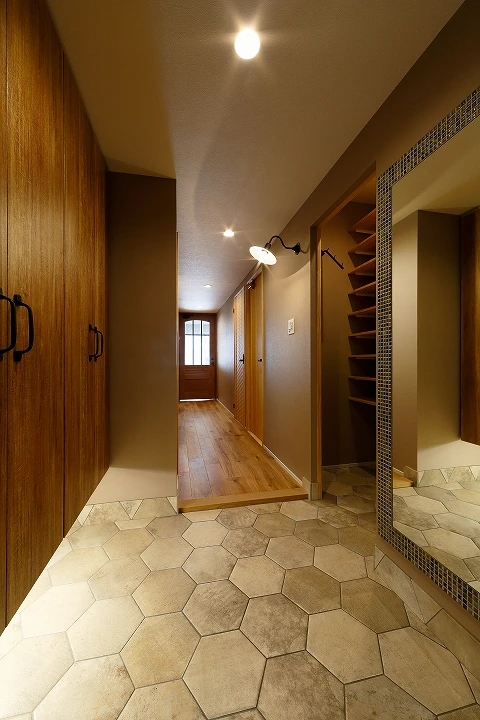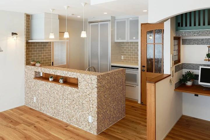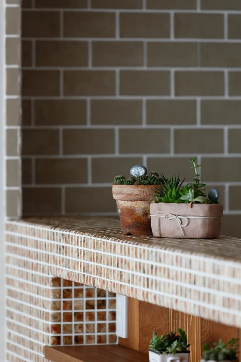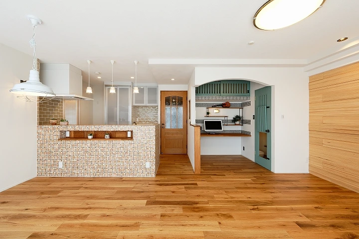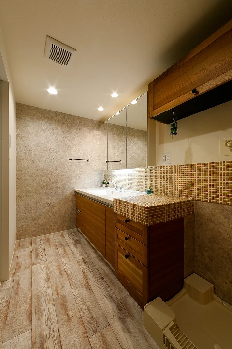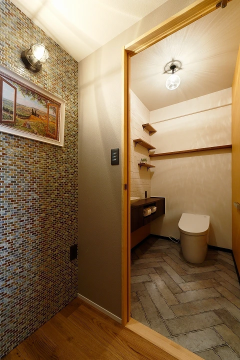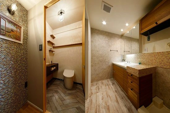 せっかくリビングをカフェスタイルにしても、トイレや洗面所が普通だと全体的な雰囲気が損なわれてしまいます。そこで、リビングと同じタイルやフローリング材を使い、統一感のあるデザインにしました。