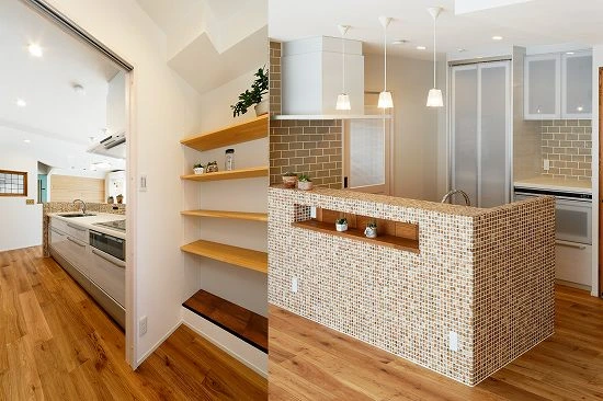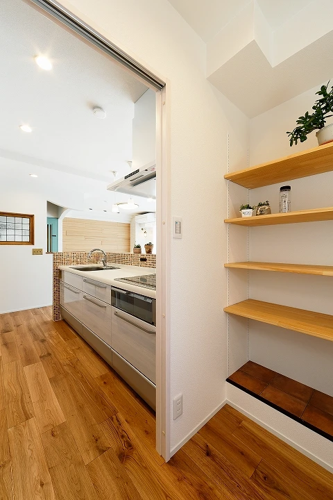 統一感のあるカフェスタイルをイメージしてLDKをデザインしました。キッチンの奥に扉付きのパントリーを設けることで、大容量の収納を実現。来客があったときも、さっと隠せるのに便利です。