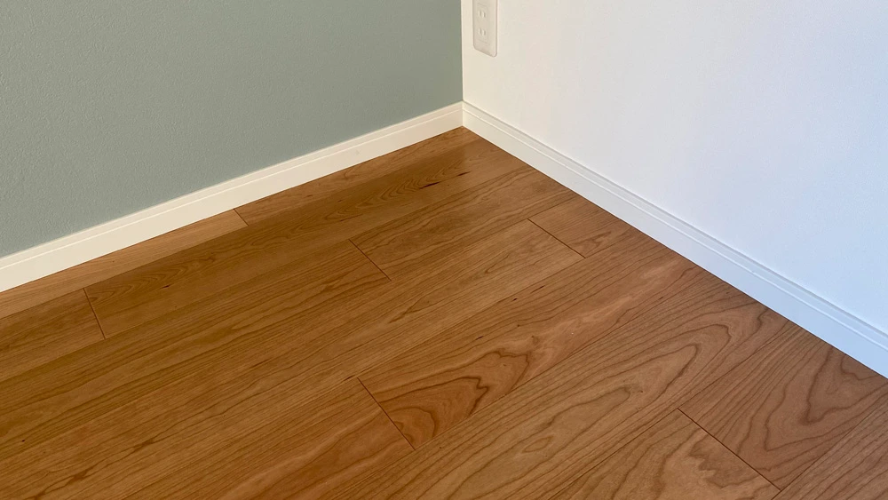 お施主様は、せっかく床を張り替えるのであればこだわりたいと、突板のフローリングを選ばれました。昨今、フローリングの表面はホンモノの木ではなく、印刷されたシート仕上げのものがほとんどです。