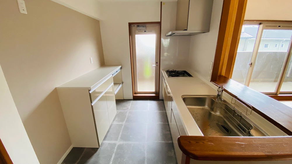 キッチンやユニットバス、トイレの水回りも一新しました。キッチンはカップボード付きのもので、食器類などキッチンで必要なものは全て収納できます。ユニットバスは、横長の鏡付きのもので空間を広く見せることができます。