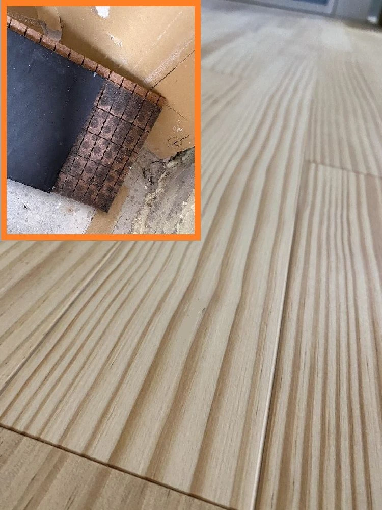 「無垢ピノアース」は、マンションでも使用できる数少ない無垢フローリング材です。画像のように、裏面にクッション材を貼ることでマンションで求められる遮音性能を確保しています。
