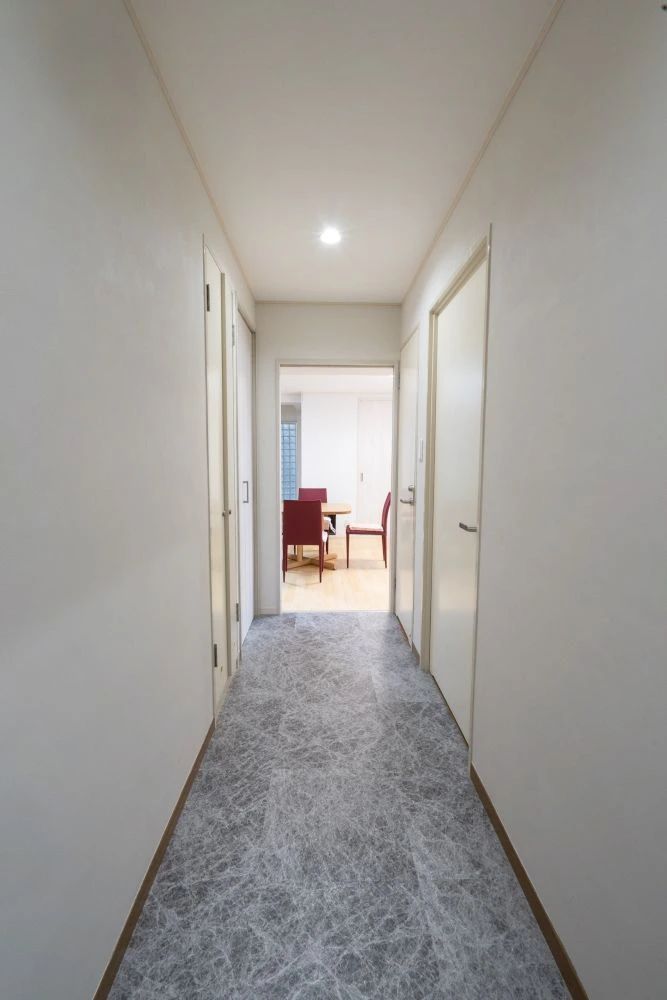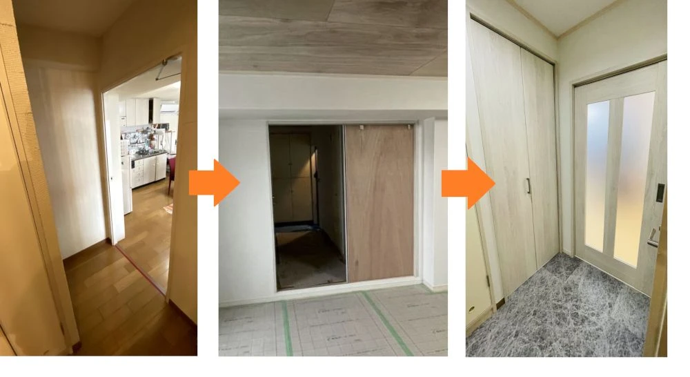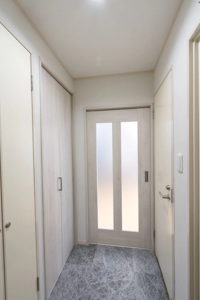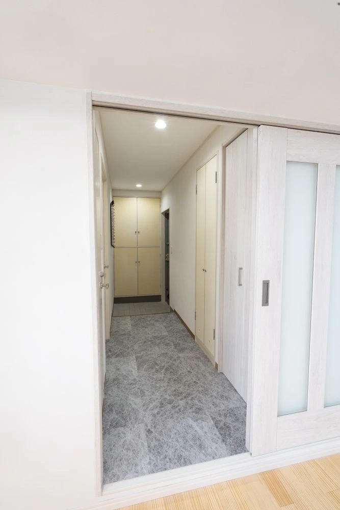 今回のリフォームでドア1枚分入り口をずらし、玄関からリビングまで一直線としたことで導線が改善しています。
