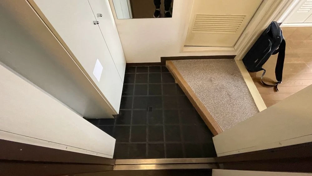J様邸の間取りでは、お風呂スペースが玄関土間横にあり、出入り口を新たに設けるとシャワールームに入るために土間に降りることとなってしまいます。そのため、あえてシャワールームへの出入りはトイレ側からとしています。トイレの床を一時的な脱衣カゴ置きにできるという副次的なメリットもあります。