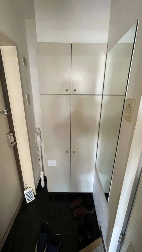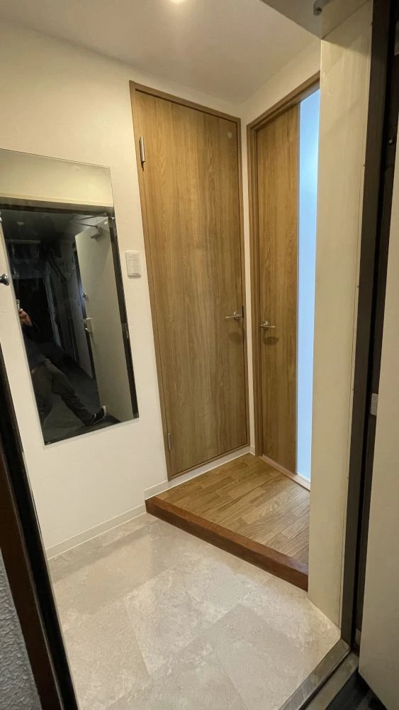 狭い玄関を占領してた下駄箱を撤去し、土間のフロアタイルと玄関框のクッションフロアを張り替えました。ワンルームマンション特有の質素な玄関が、お客様の趣味に合う易しい印象に生まれ変わりました。