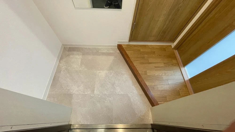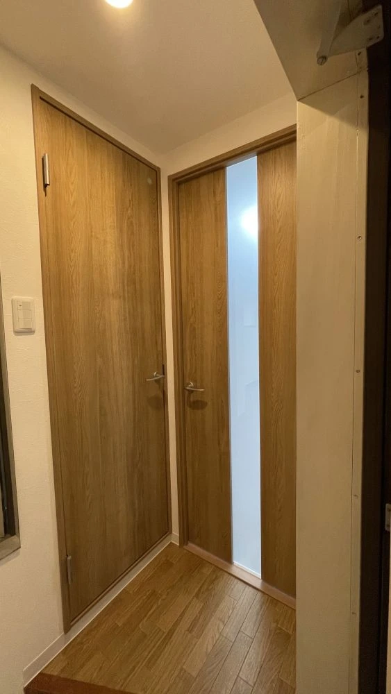 モノトーンで無機的な印象だった室内は建具を木目調に変更し、温かみを感じさせます。玄関は、框を建具に合わせた木目調のクッションフロアに、土間を柔らかな色味のフロアタイルで上張りし、同じ玄関とは思えないほど印象が変わりました。