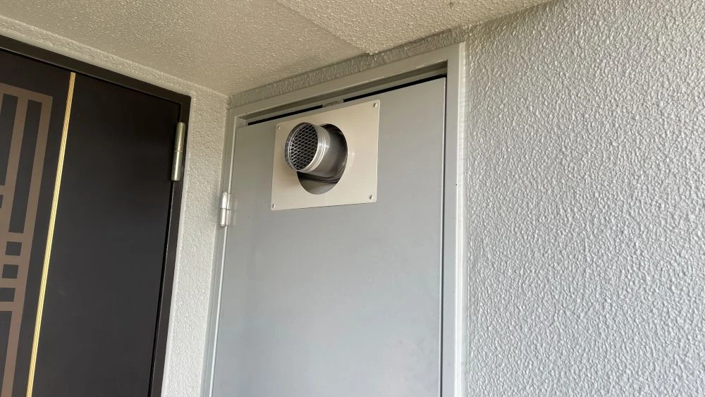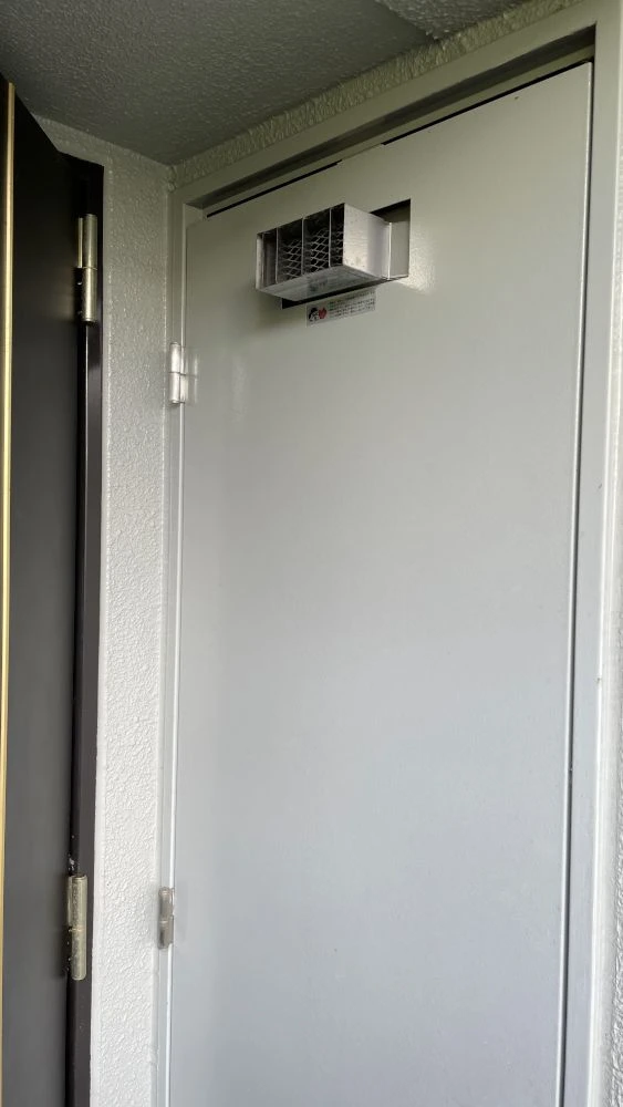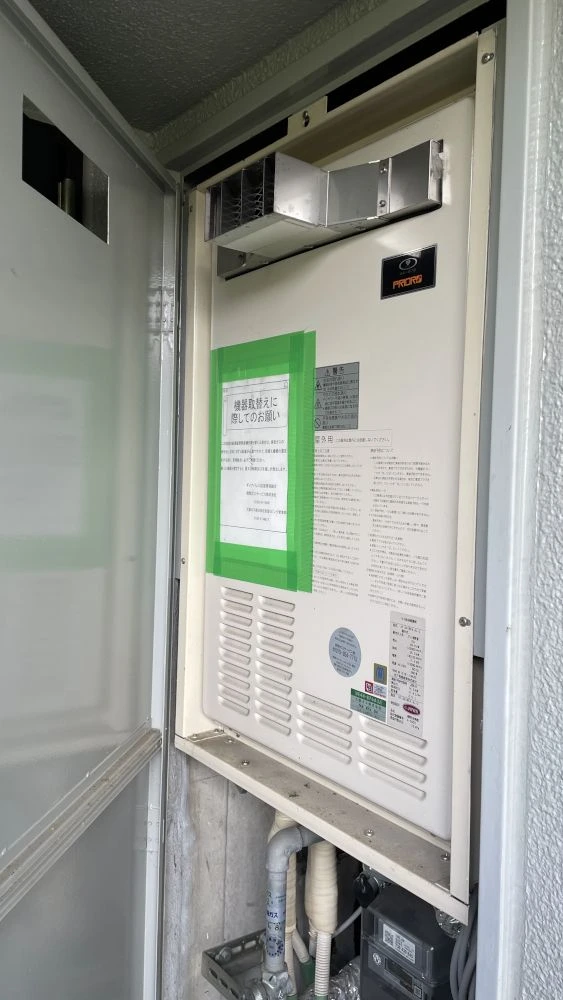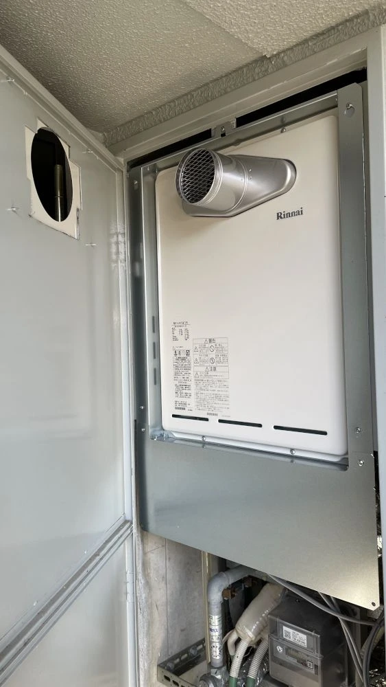 集合住宅の給湯器は、扉の内部に格納されているタイプが一般的です。I様邸の従来の給湯器は、排気管が角形だったため、扉の穴も四角でした。
