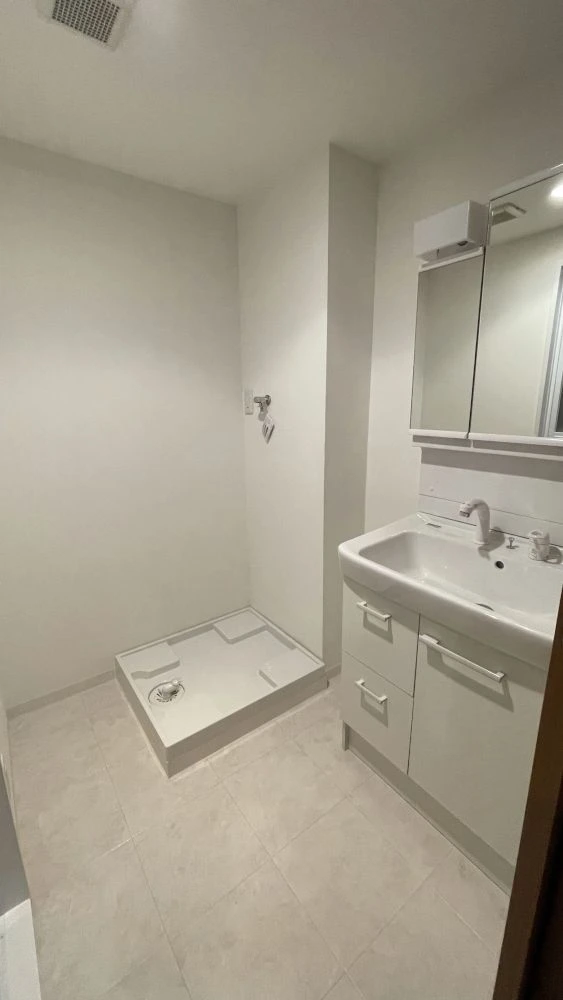 洗面台横にあった垂れ壁を撤去し、洗面台の横に洗濯パンを移設しました。