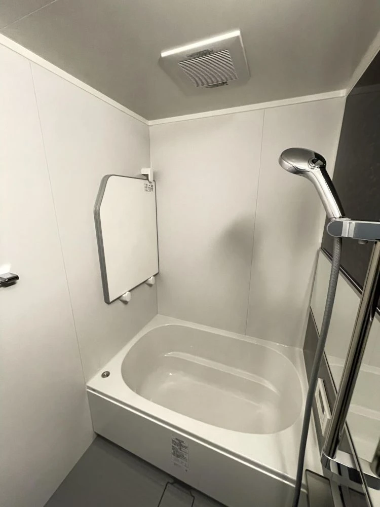 ユニットバスは、キッチンと同じくリクシルの「リノビオ」です。白系のカラーでまとめた浴室を石目調の高級感があるアクセントパネルで引き締めています。肌への当たりが心地よい人造大理石「ルフレトーン」の浴槽で、お風呂タイムをより快適に過ごしていただけます。