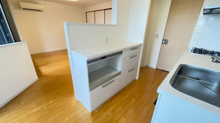 カウンターより少し高さのある腰壁が目隠しとなって、居室側からキッチンを見てもすっきりした印象です。